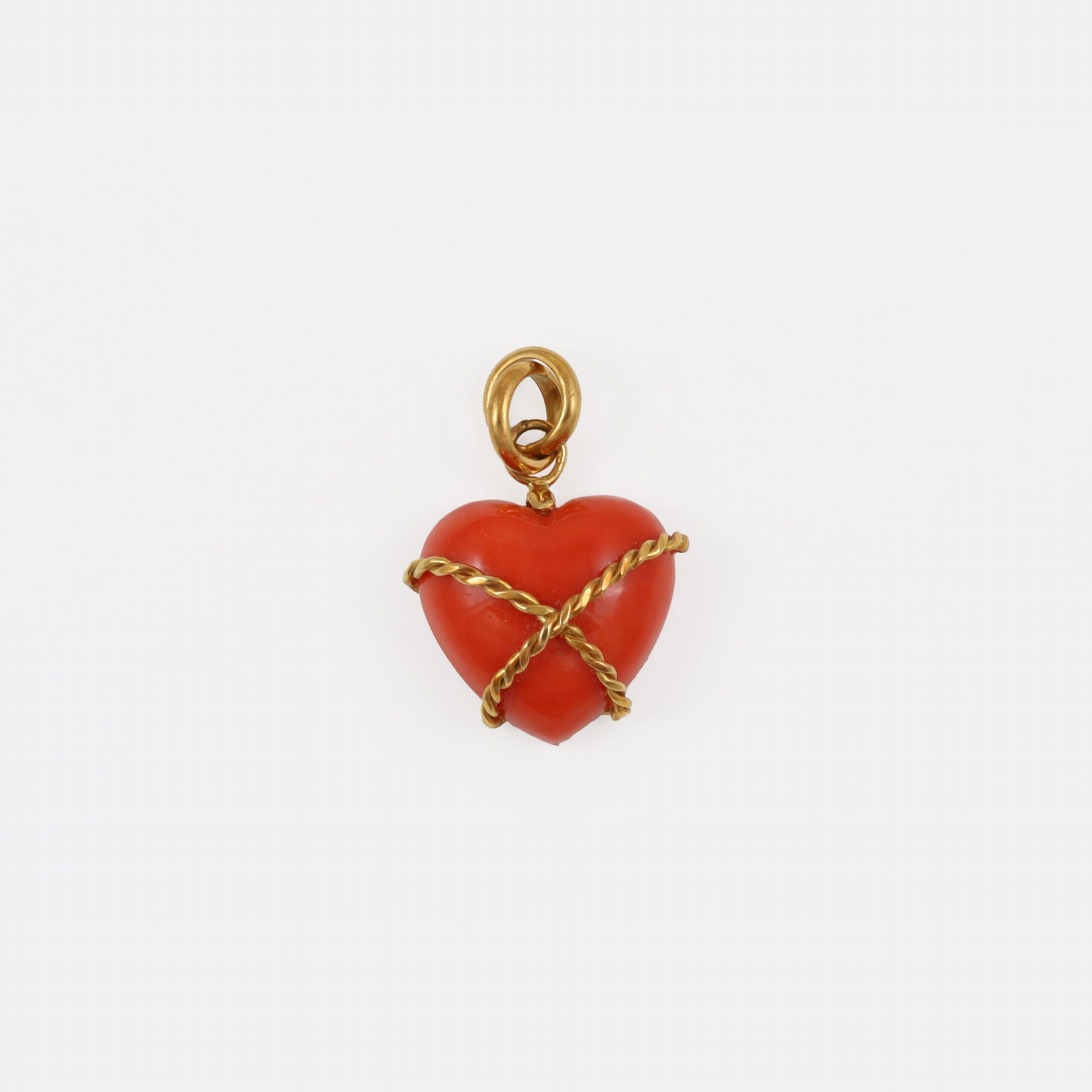 in oro giallo con cuore in corallo trattenuto da un motivo a cordoncino, gr. 10,7. Dimensioni 3,4 x 2,4 cm ca.