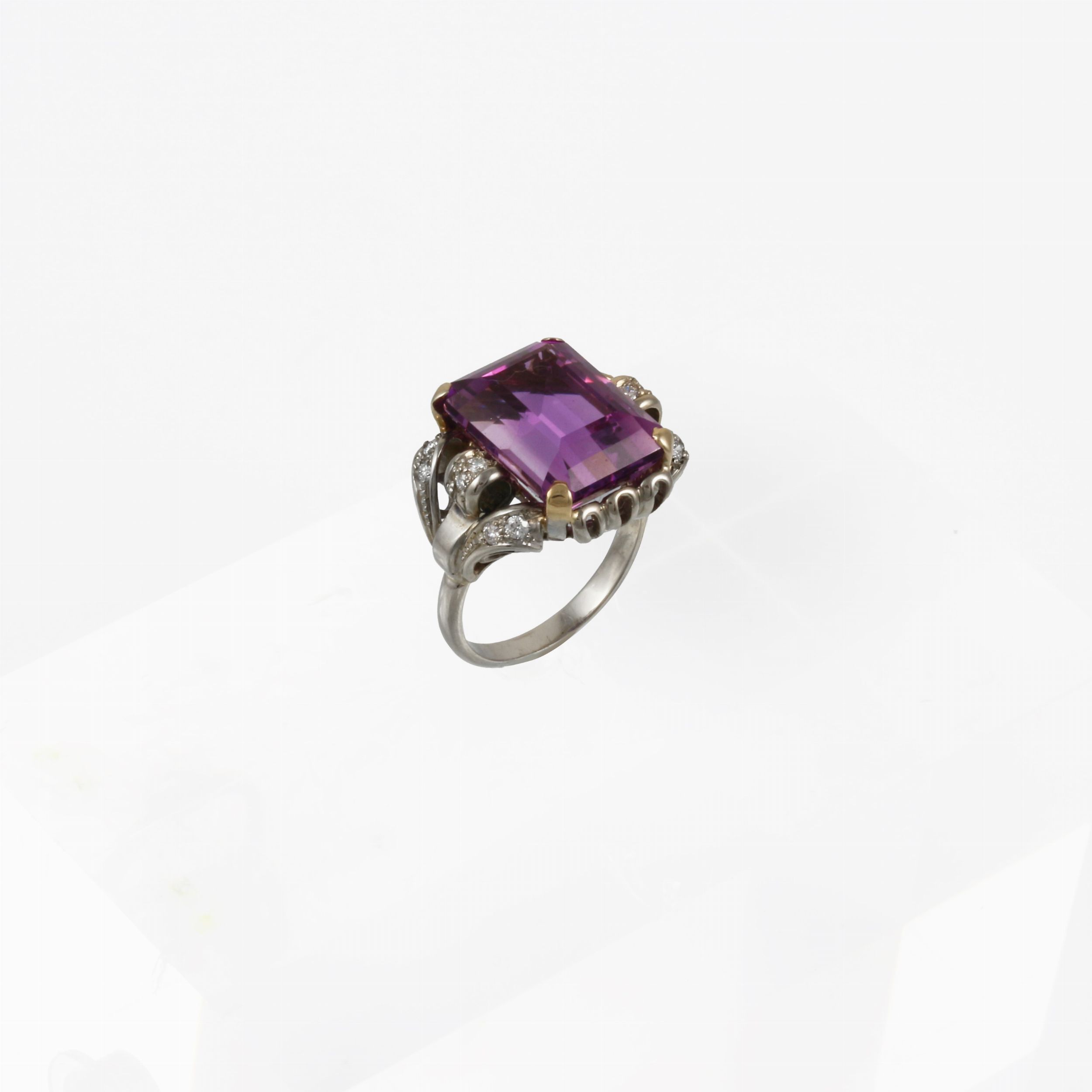 in oro bianco e giallo con ametista rettangolare posta al centro, affiancata da motivi traforati a volute con brillanti, gr. 10,2. Misura 16,5