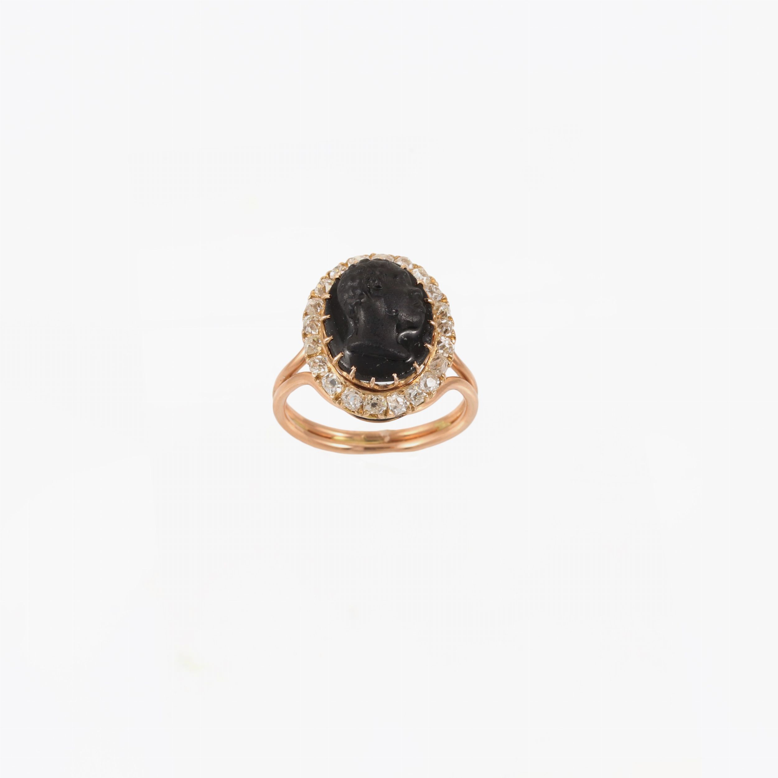 in oro rosa con cammeo in onice 'moretto' contornato da diamanti taglio 'old mine' (sbeccature), gr. 6,2. Misura 16,5