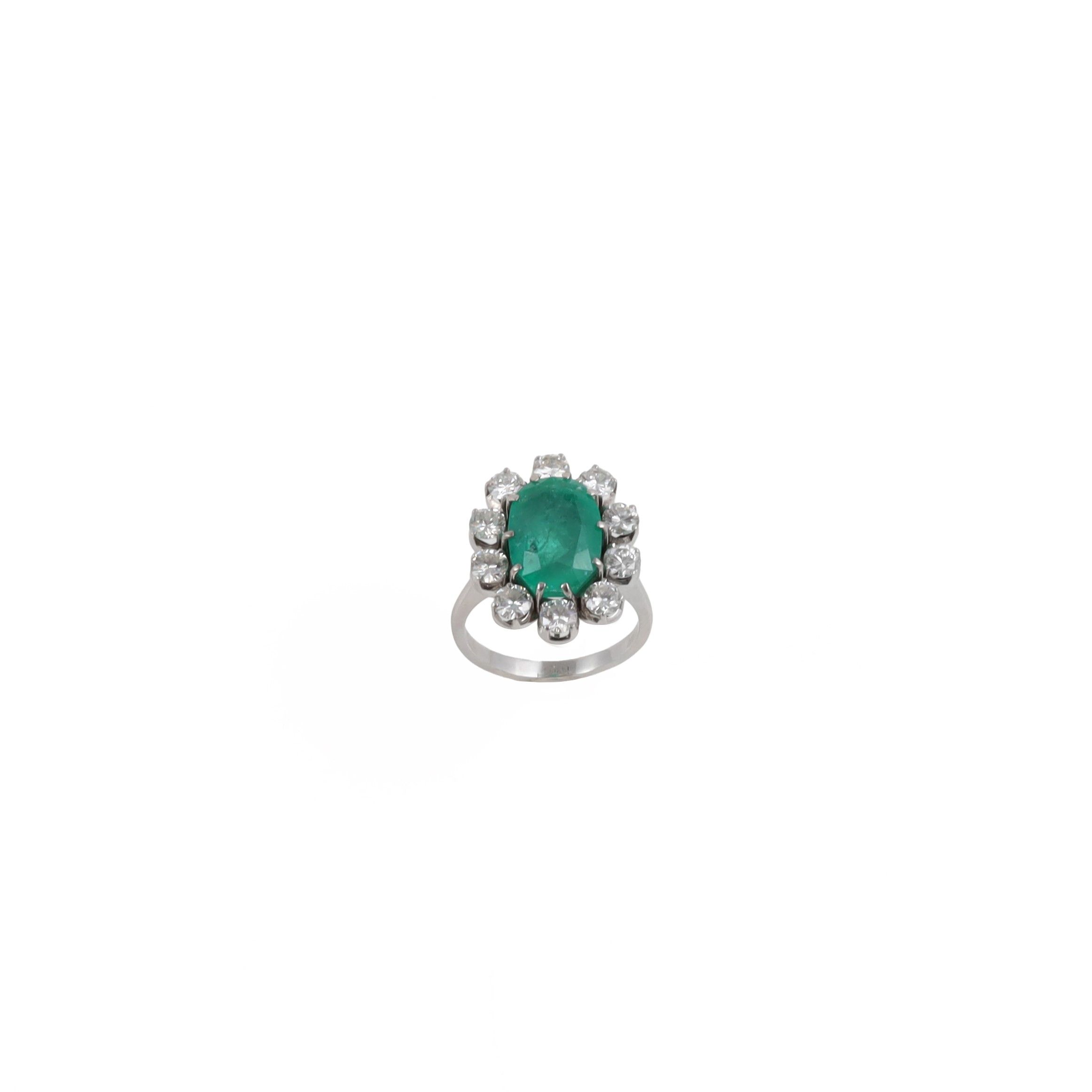 in oro bianco con brillanti del peso complessivo di 1,50 ct ca. e smeraldo ovale posto al centro, gr. 6,5. Misura 14