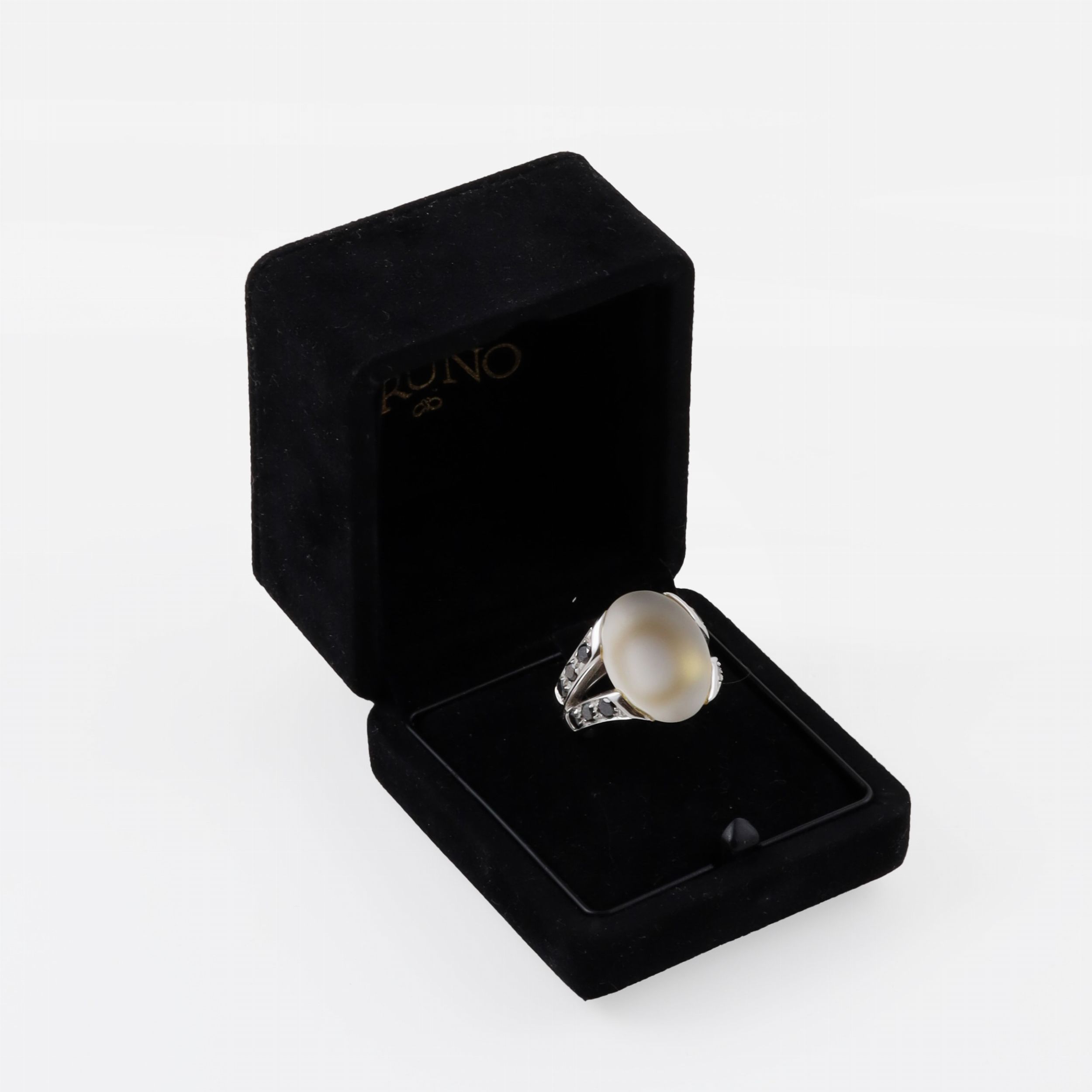 in oro bianco con quarzo ialino ovale posto al centro, affiancato da brillanti neri disposti su due file, gr. 15. Corredato da custodia. Misura 14