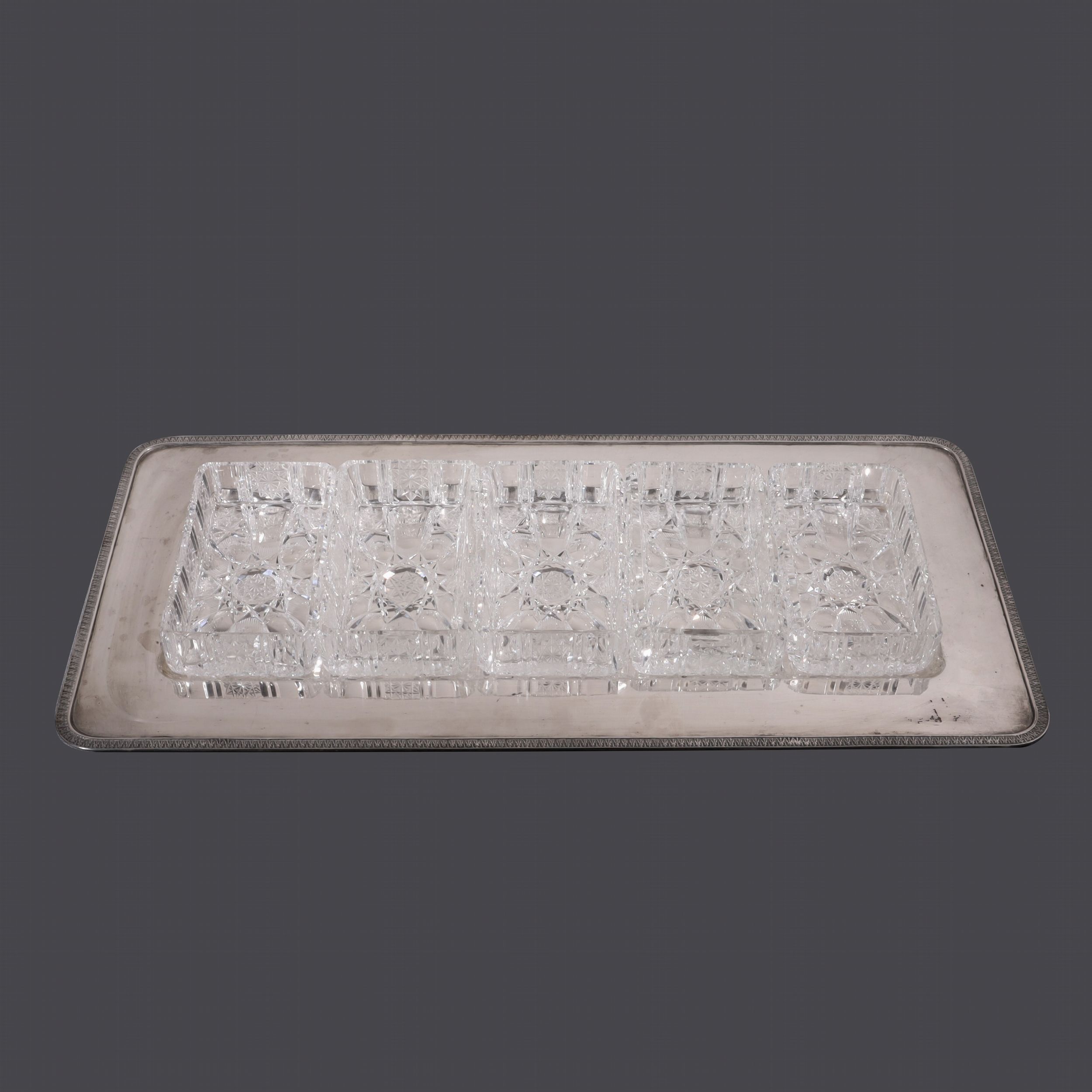 in argento a corpo rettangolare con bordura decorata a palmette, completa di cinque contenitori in vetro molato, gr. netti 797 ca. Dimensioni 47,5 x 23,3 cm ca. Manifattura italiana