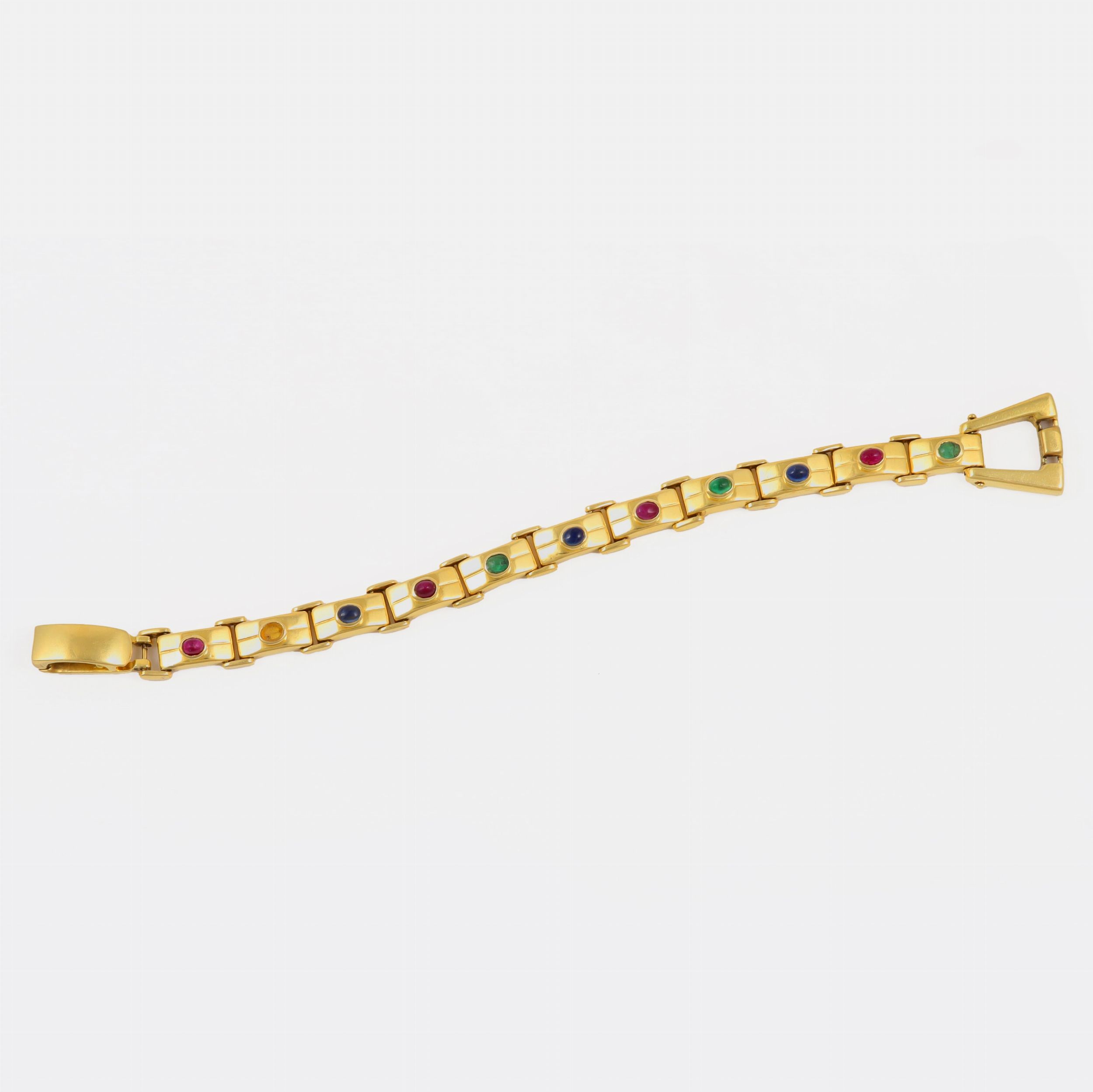 in oro giallo a segmenti snodati con rubini, smeraldi (uno mancante) e zaffiri taglio cabochon, gr. 29,8. Lunghezza 18 cm Firmato: MTM