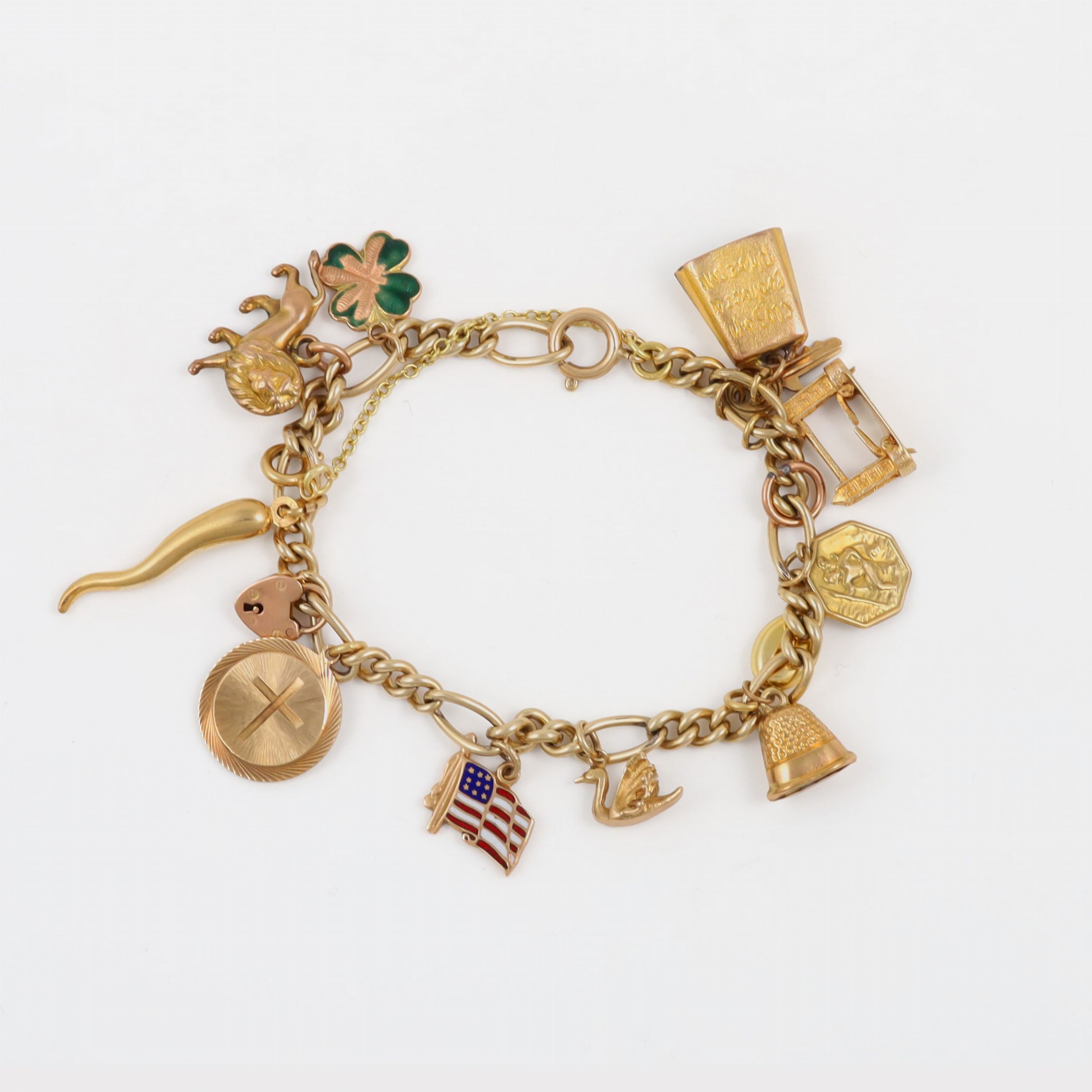 in oro a titolo basso con 'charms', gr. 26,5. Lunghezza 19 cm
