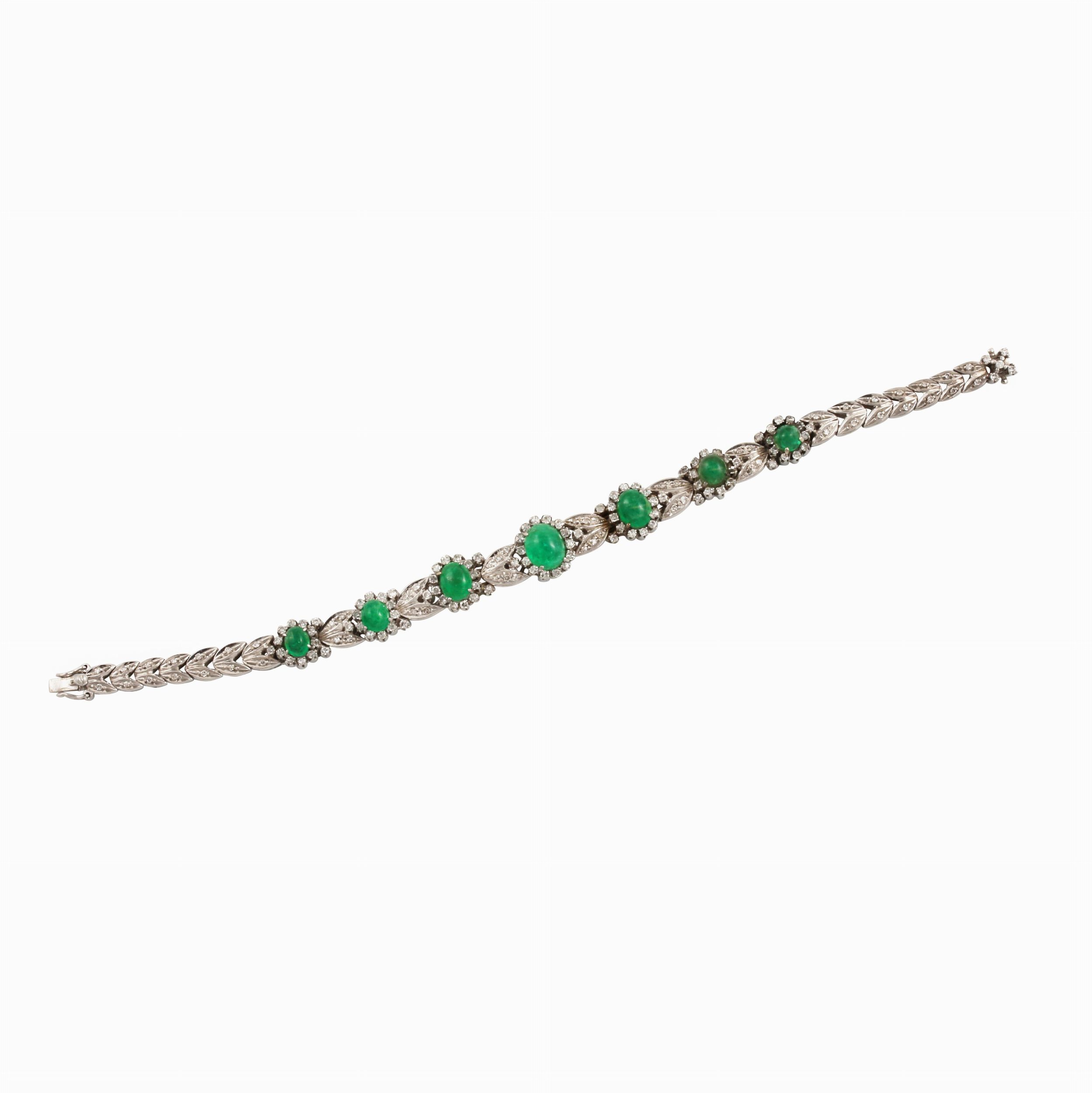 in oro bianco a motivi fogliacei contrapposti, ornato da smeraldi ovali posti in gradazione e piccoli diamanti, gr. 24,8. Lunghezza 17,5 cm