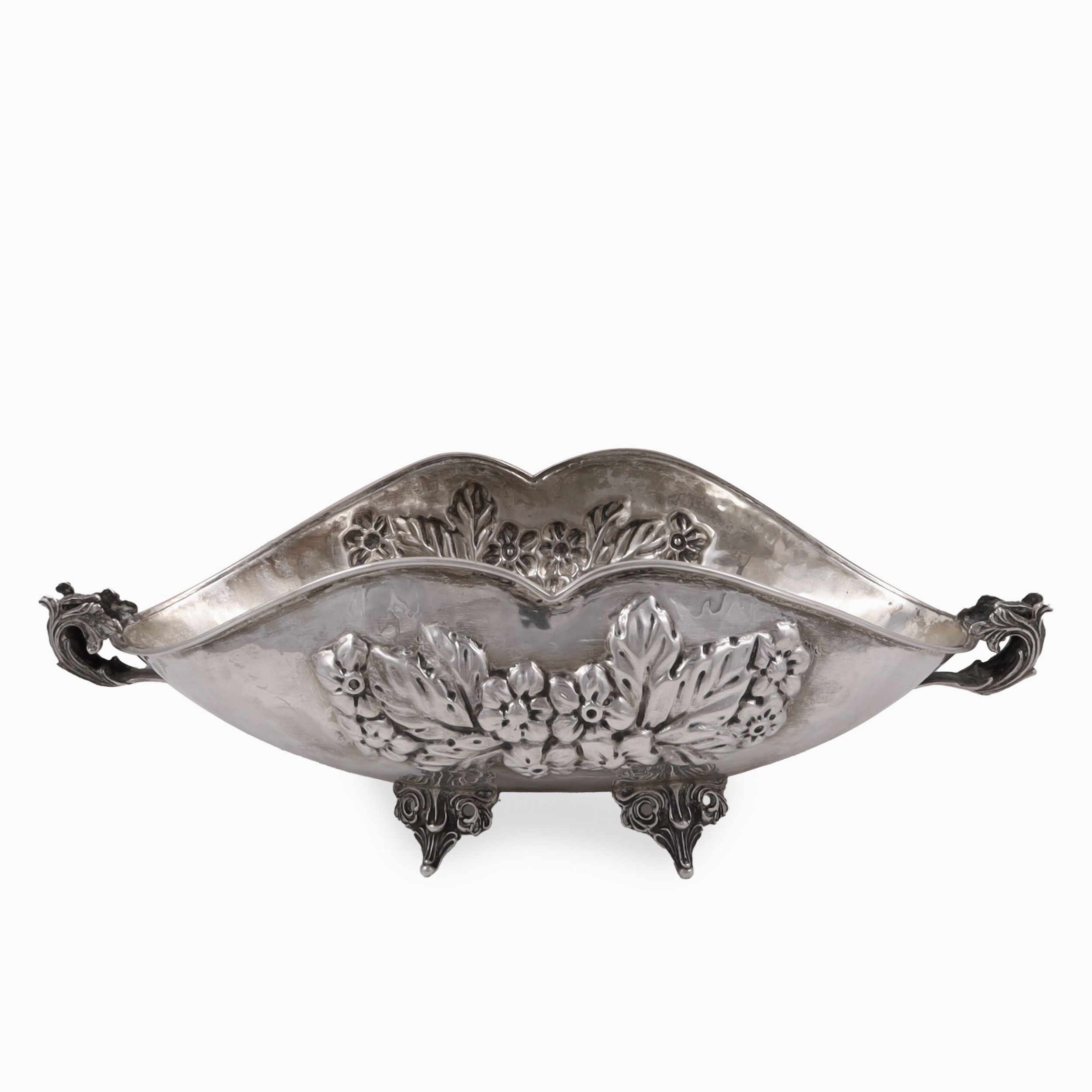 in argento 925/1000 a lavorazione martellata, corpo a navicella sbalzato a motivi floreali con prese laterali fogliate, poggiante su piedini, gr. 570 ca. Dimensioni 35,5 x 17 cm, altezza 11 cm ca.