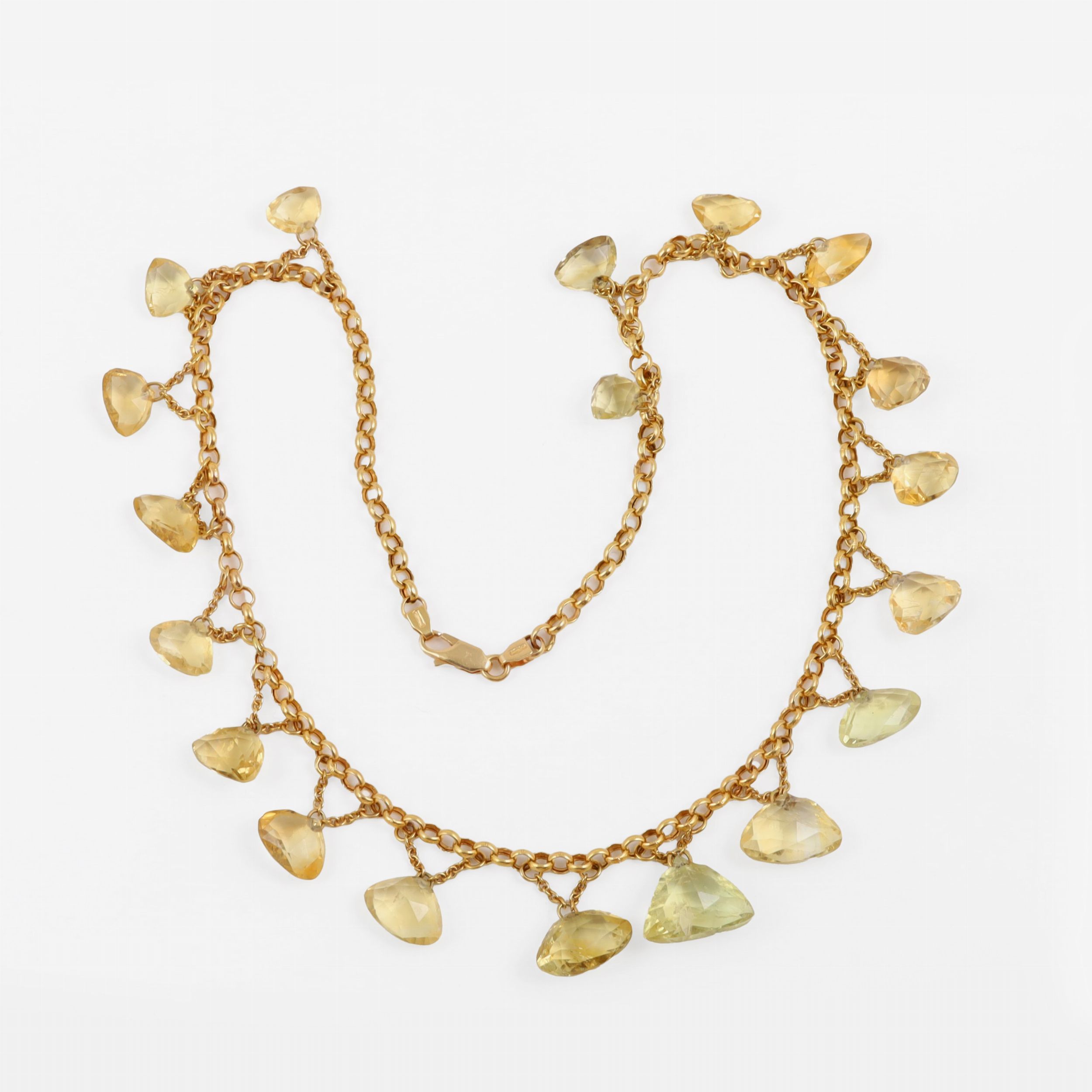 in oro giallo a maglie tonde, ornata da quarzi citrini triangolari taglio briolette posti in gradazione, gr. 28,1. Lunghezza 44 cm