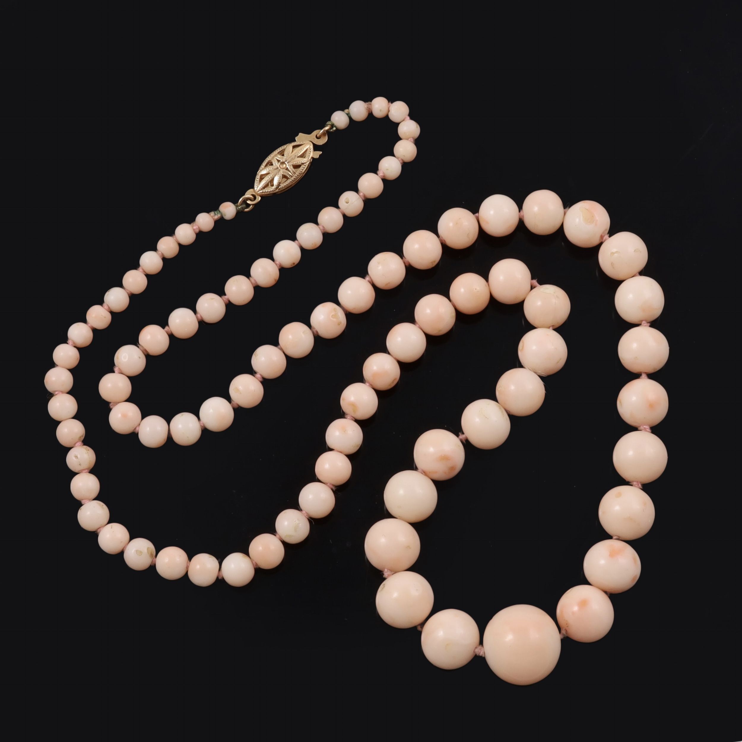 a un filo di sfere di corallo rosa poste in gradazione con chiusura in oro giallo. Lunghezza 60 cm