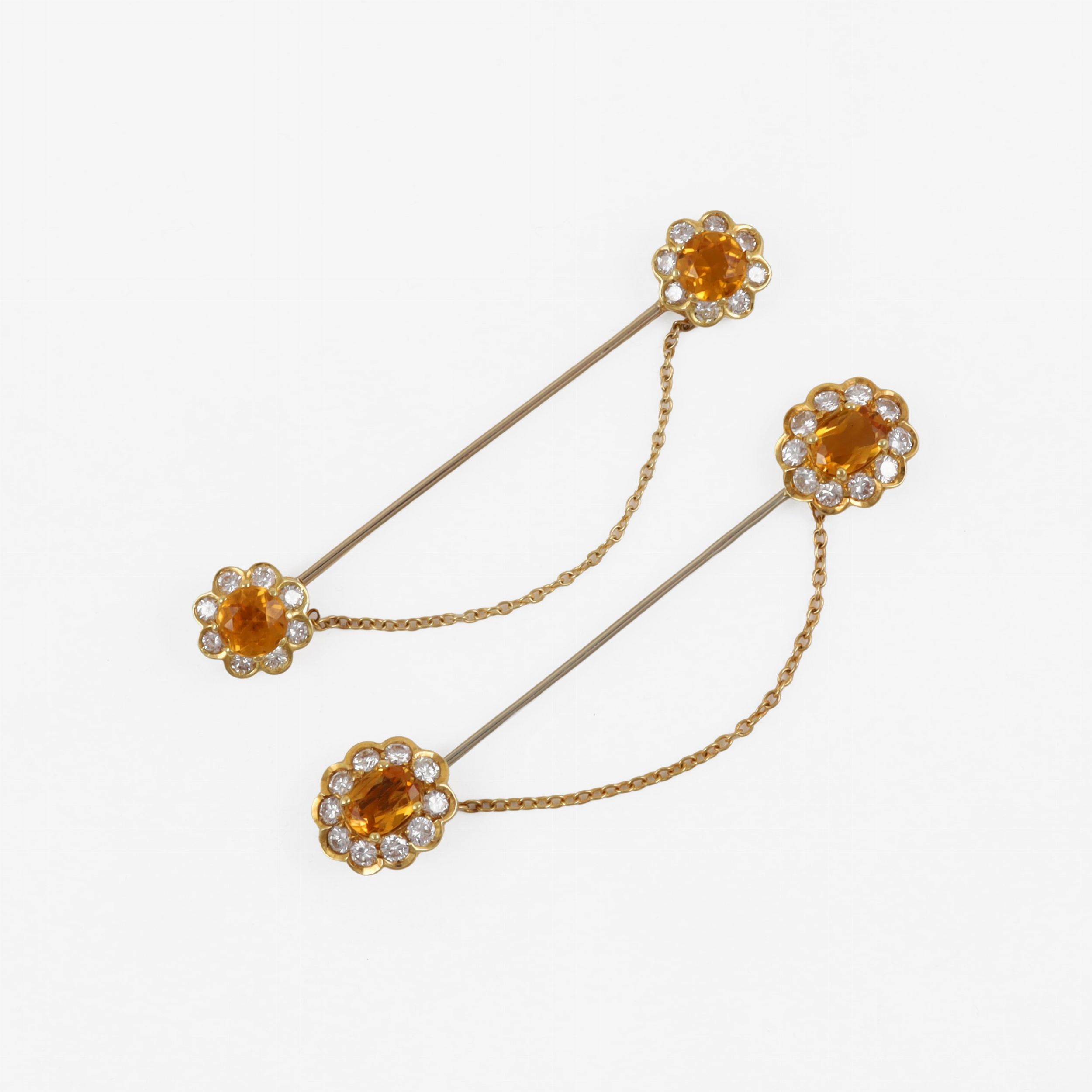 in oro giallo e bianco a motivi floreali con tormaline e brillanti del peso complessivo di 1,30 ct ca., gr. complessivi 8,4. Lunghezza 6 cm ca.