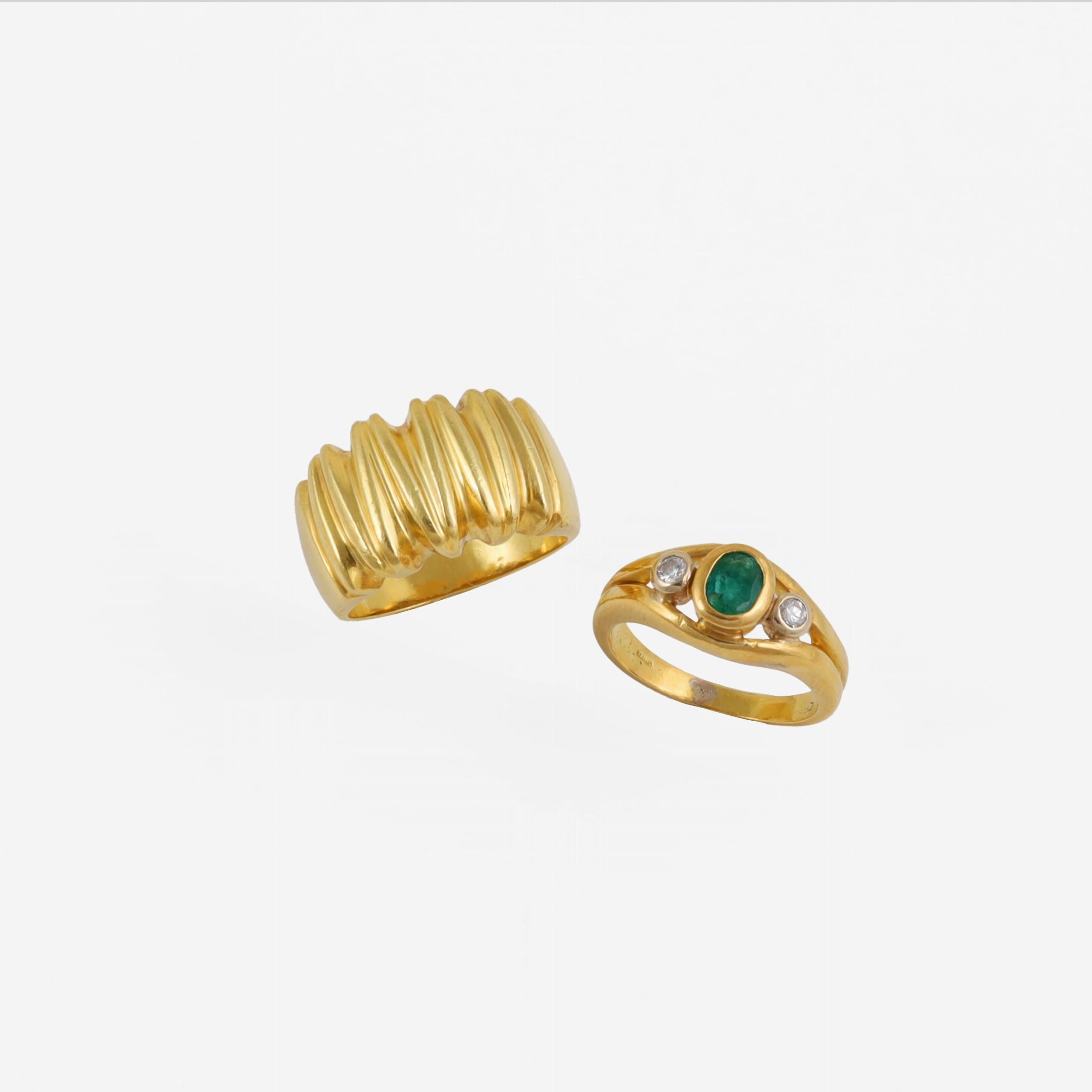 in oro giallo di cui uno con smeraldo e piccoli brillanti, gr. complessivi 16,5. Misura 14 e 12