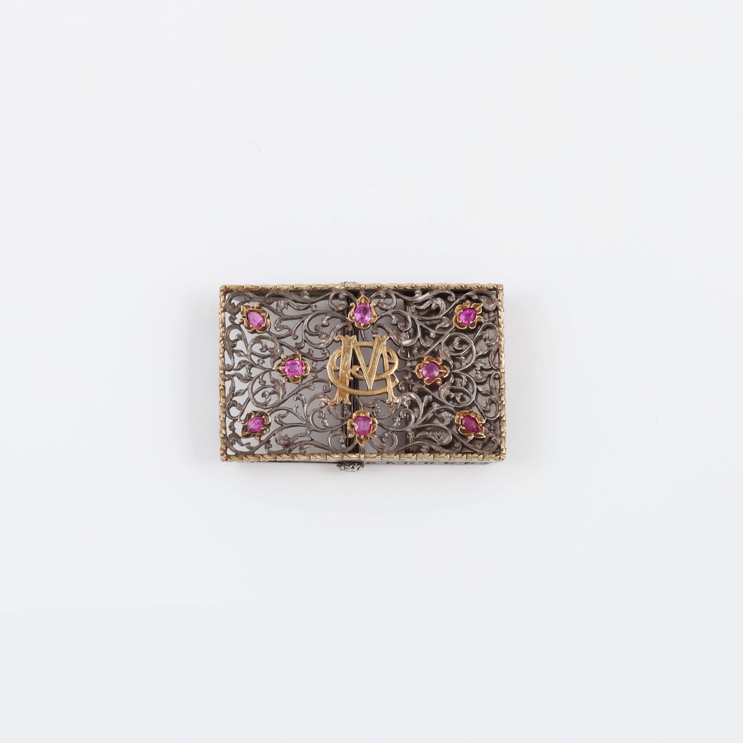 a forma rettangolare in argento e oro traforata a motivi vegetali, punteggiata da rubini con monogramma al centro, gr. 22,3. Dimensioni 4,5 x 2,8 cm ca.