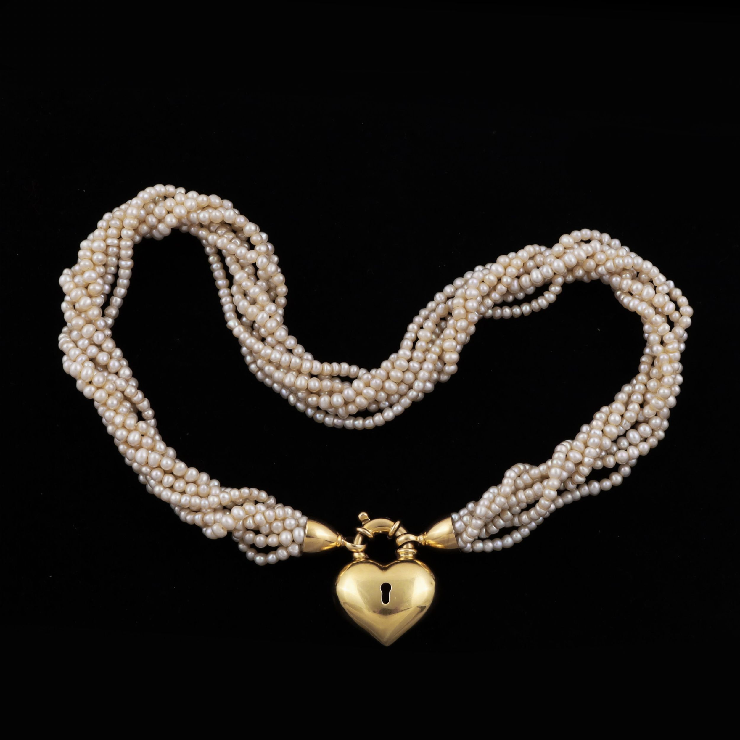 'torchon' a sette fili di perle d'acqua dolce con chiusura anteriore in oro giallo a guisa di lucchetto cuoriforme. Lunghezza 41 cm ca.
