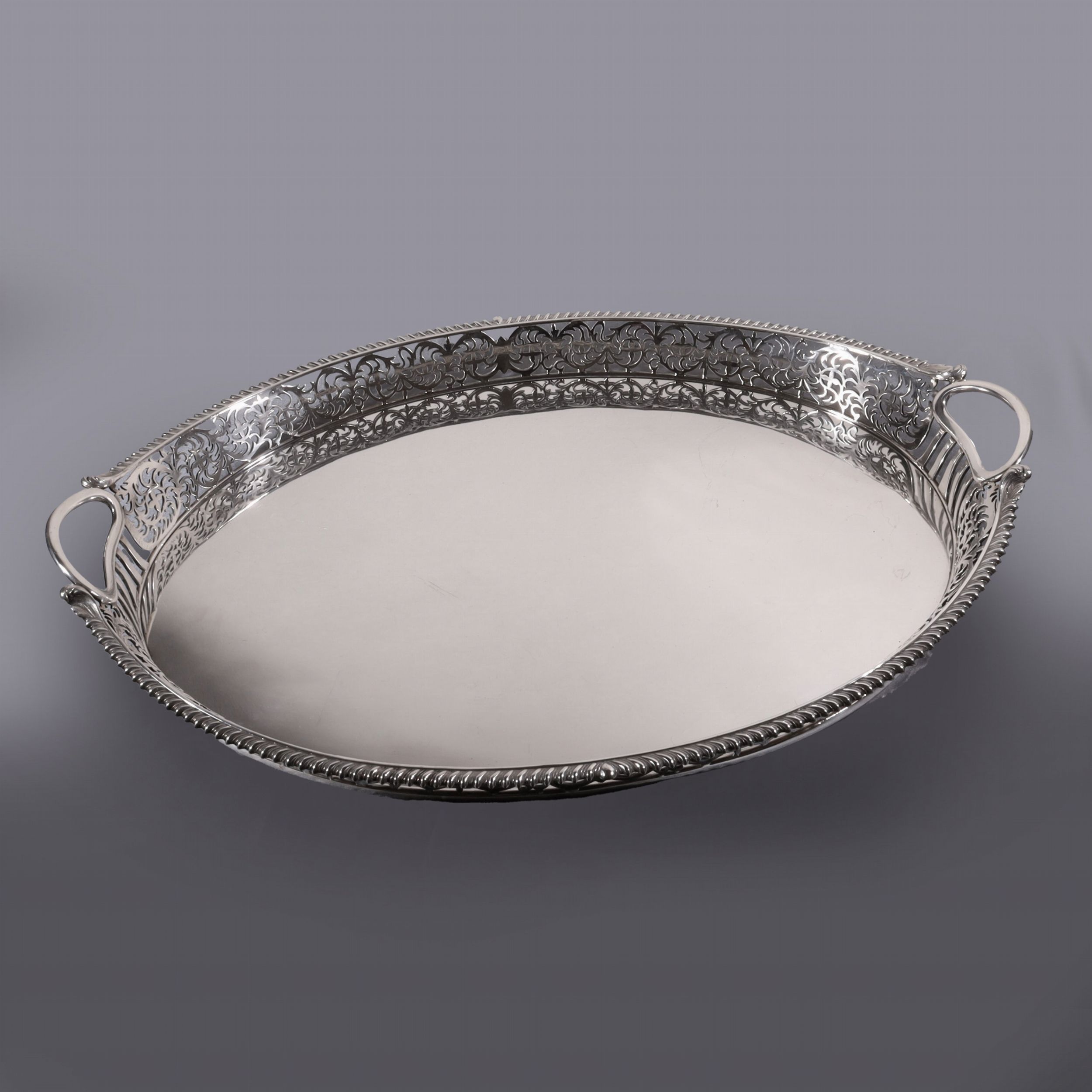 in argento 925/1000 a corpo ovale con fascia traforata e manici laterali, gr. 2.900 ca. Dimensioni 60 x 42 cm, altezza 5 cm ca. Manifattura inglese