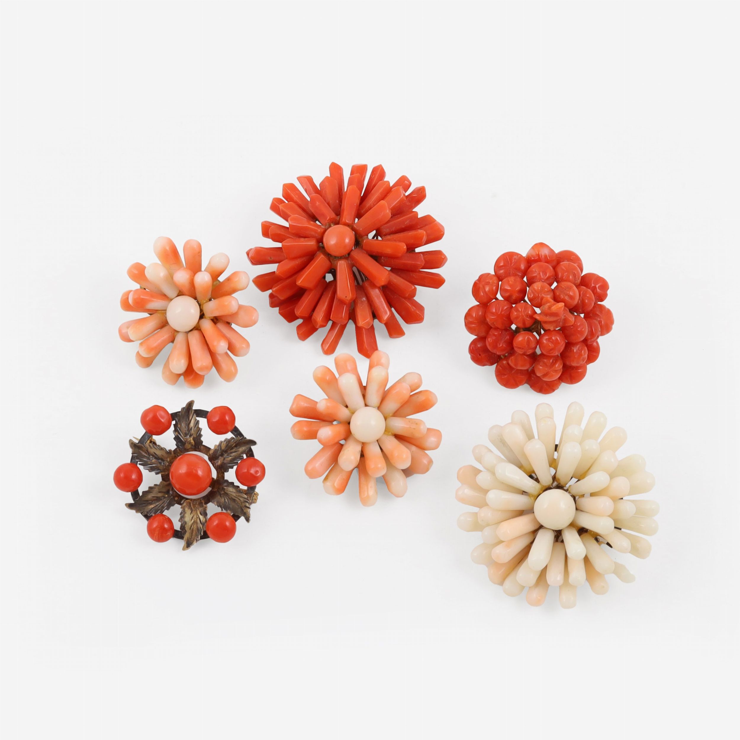 composto da quattro spille e un paio di orecchini a clip d'ispirazione floreale con coralli, montature in metallo. Diametro spille 4 cm e 3 cm ca. Orecchini diametro 3 cm ca.