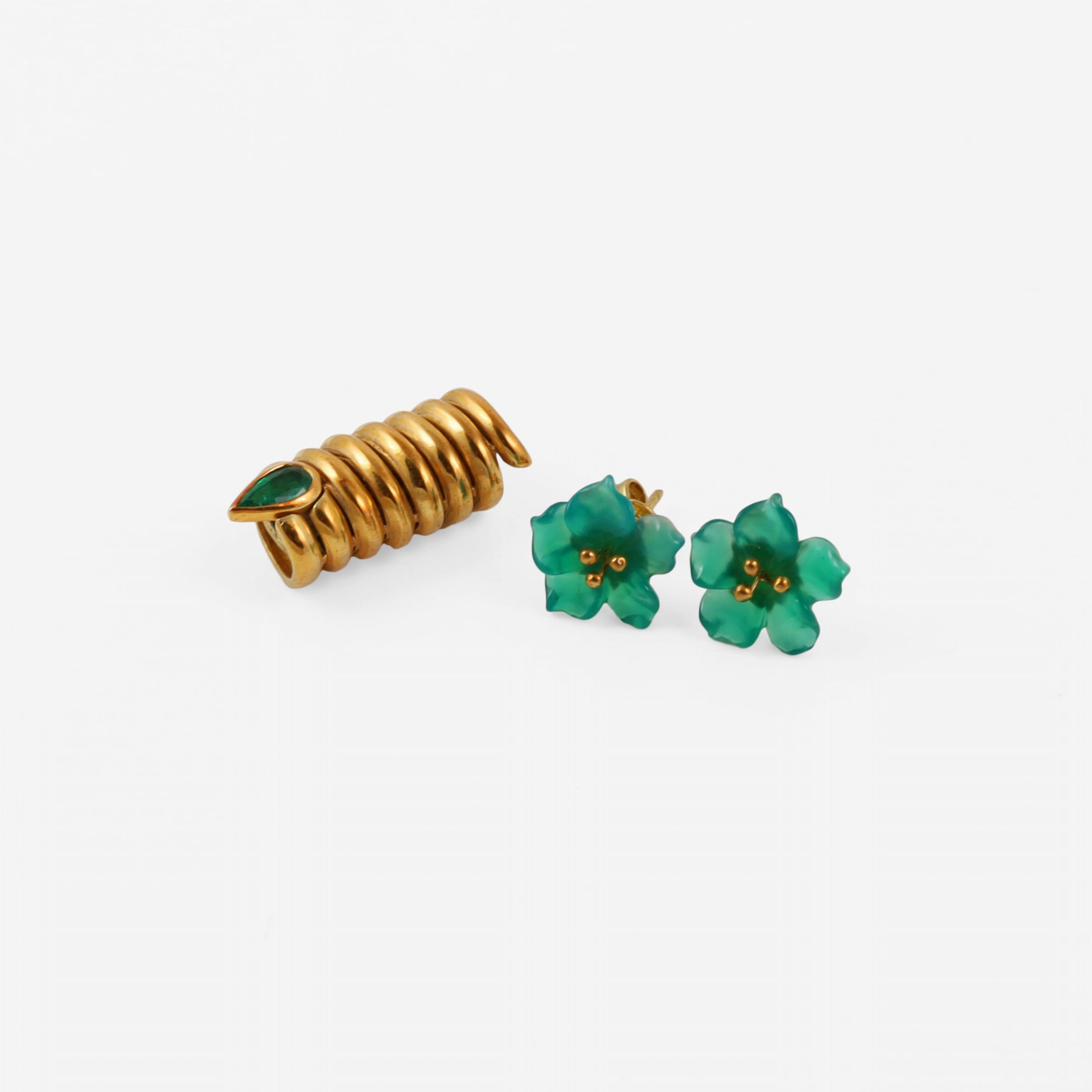 composto da fermezza firmata Damiani in oro giallo a spirale con smeraldo a goccia e orecchini in oro giallo con fiori in crisoprasio, gr. complessivi 8,4. Dimensioni fermezza 2,4 x 1 cm ca.; orecchini diametro 1 cm ca.