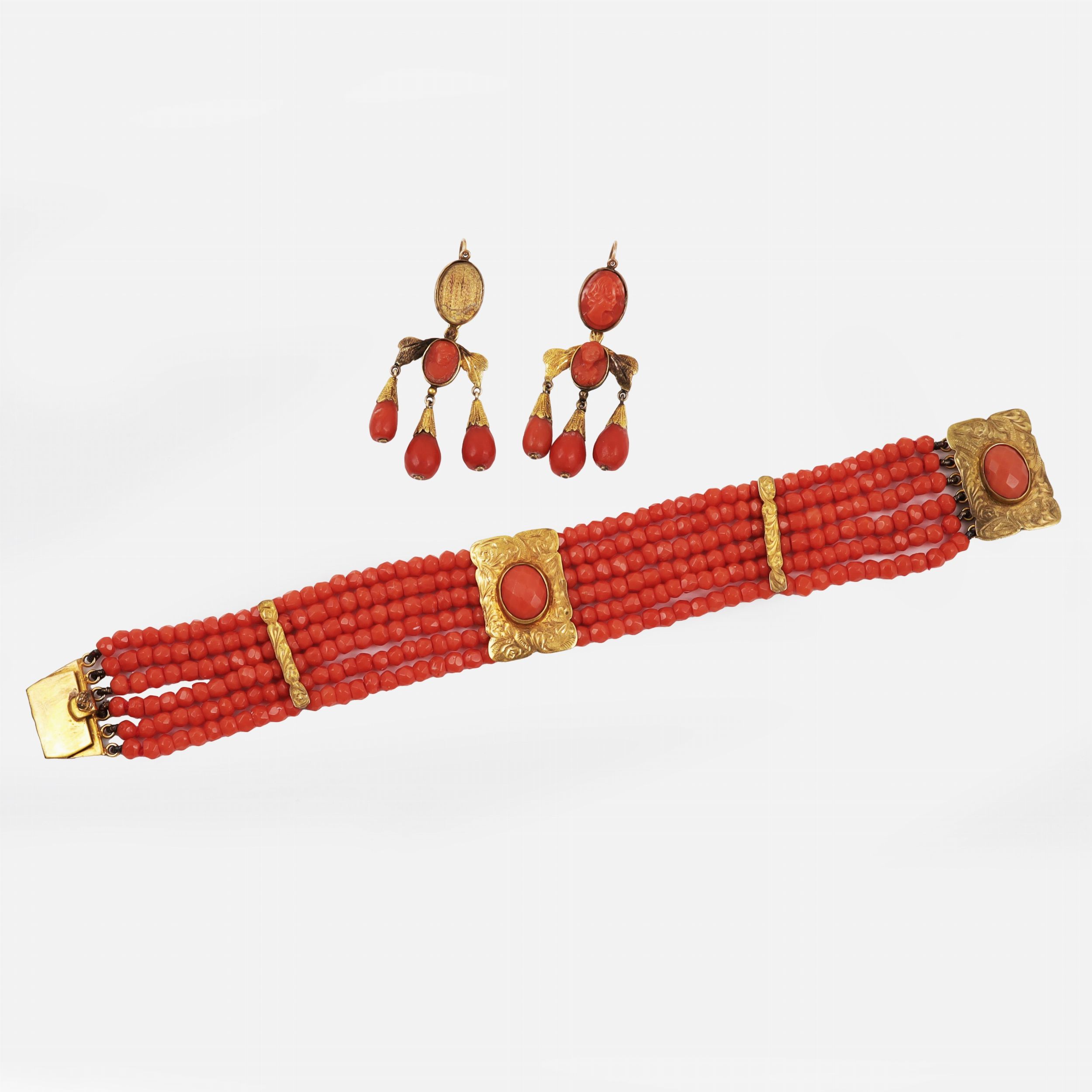 composto da bracciale a sei fili di sfere sfaccettate di corallo e placche in oro a titolo basso incise con coralli cabochon sfaccettati; orecchini pendenti in oro a titolo basso e oro 750/1000 con coralli a goccia e incisi a cammeo (uno mancante), gr. complessivi 43,7. Lunghezza bracciale 19 cm; orecchini 5 cm ca.
