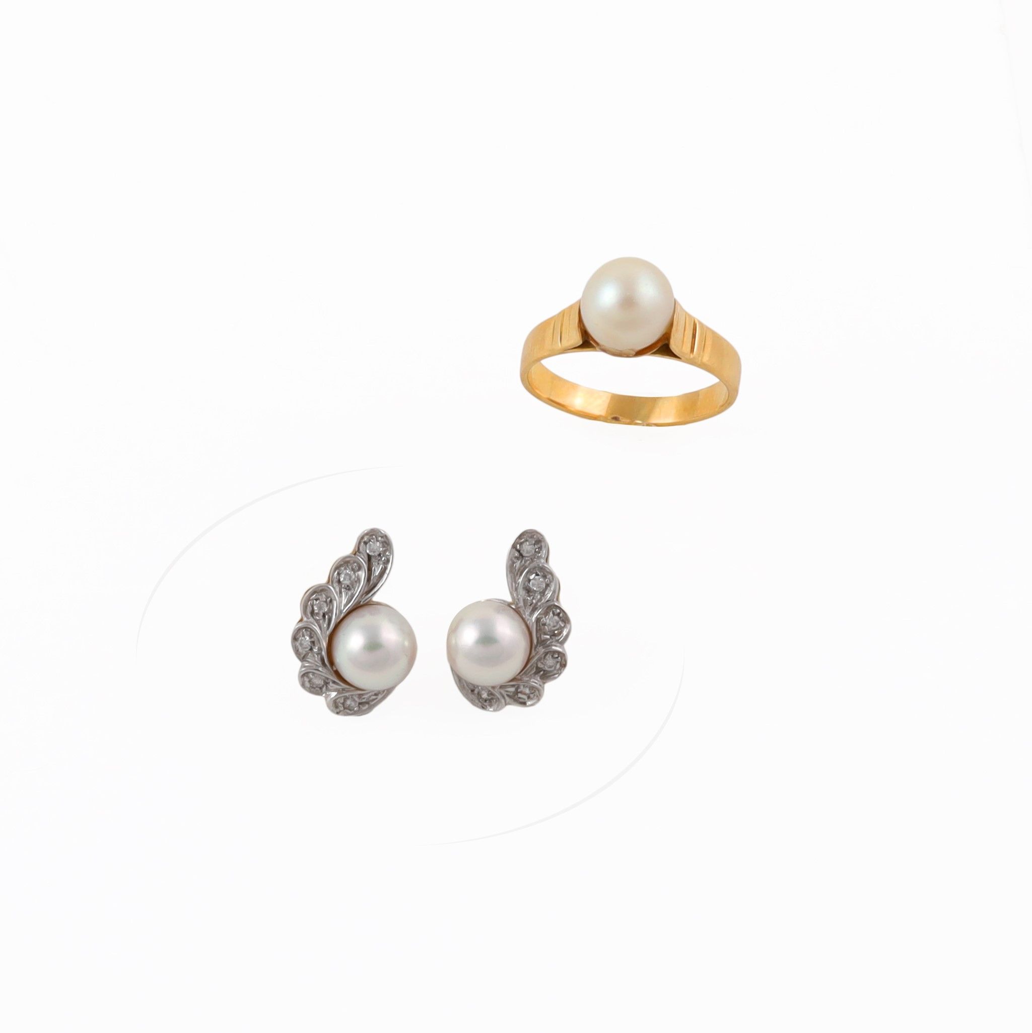 composto da anello in oro giallo con perla coltivata e orecchini (privi di fermo) in oro bianco con perle coltivate e piccoli brillanti, gr. complessivi 8,4. Misura anello 14 Orecchini firmati: Nimei