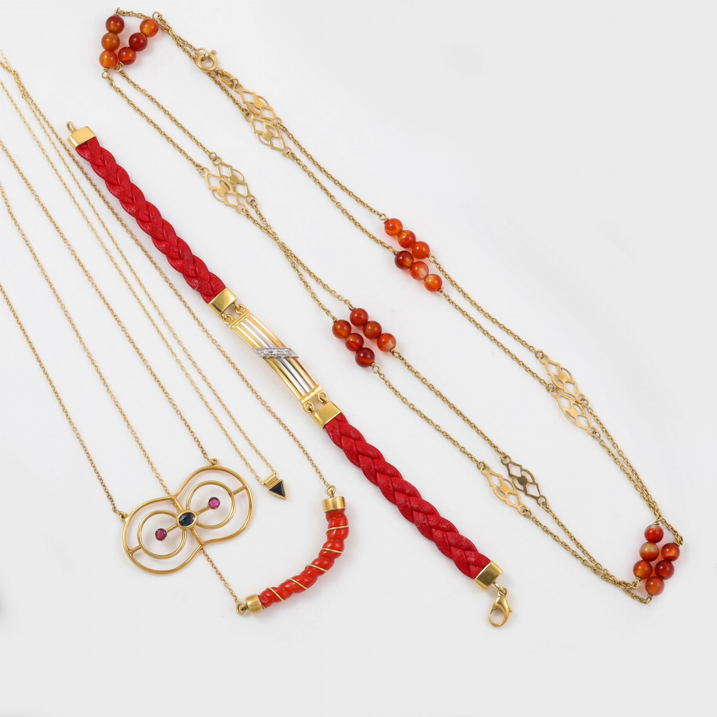 composto da lunga catena con sfere in corniola, bracciale in cuoio intrecciato con piastrina e chiusura in oro giallo e bianco con piccoli brillanti e tre girocolli con zaffiri, rubini e corallo, gr. complessivi 28,3. Lunghezza bracciale 17,5 cm, collane 88, 41, 40 e 38 cm