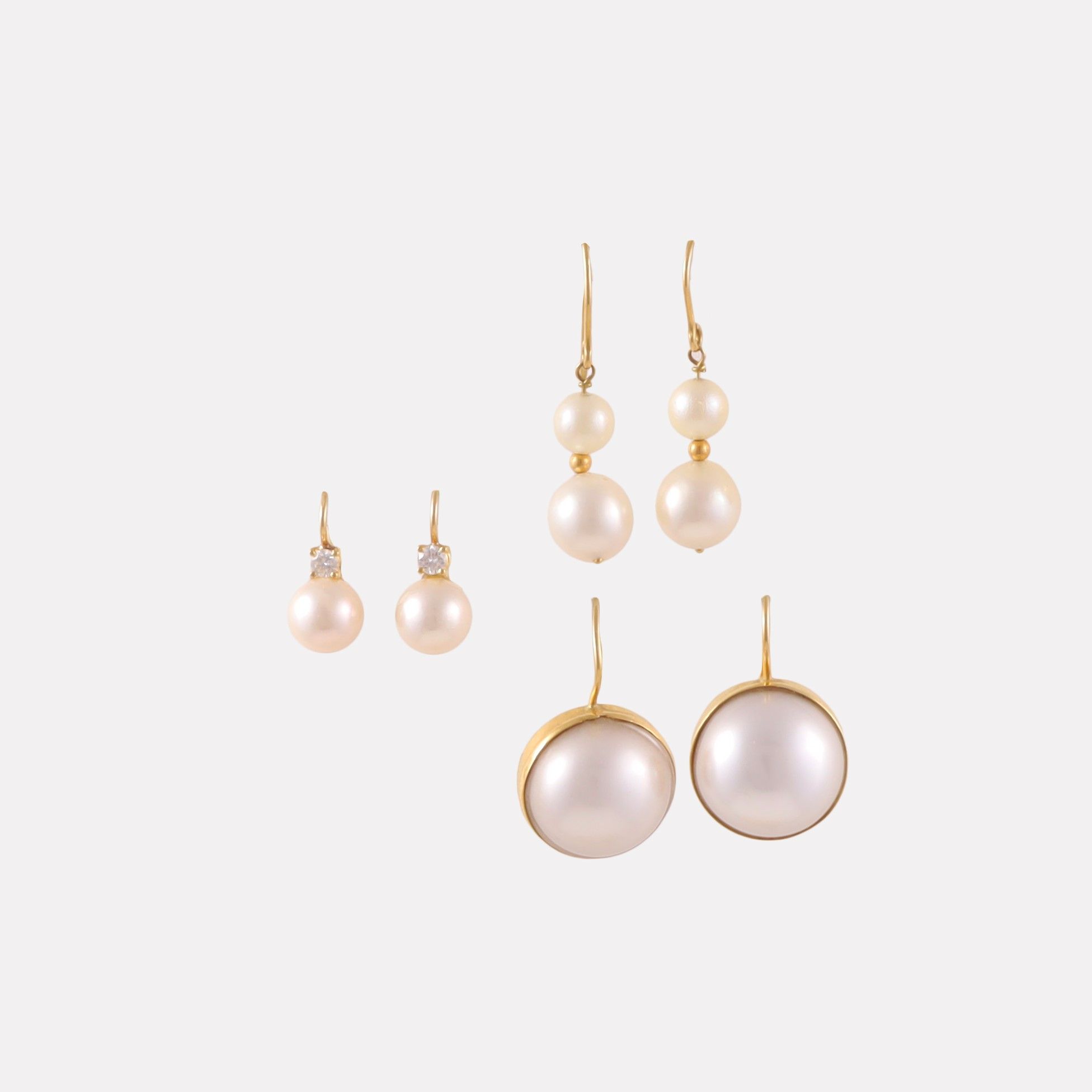 composto da tre paia di orecchini in oro giallo con brillanti, perle coltivate e perle mabč, gr. complessivi 16,1.