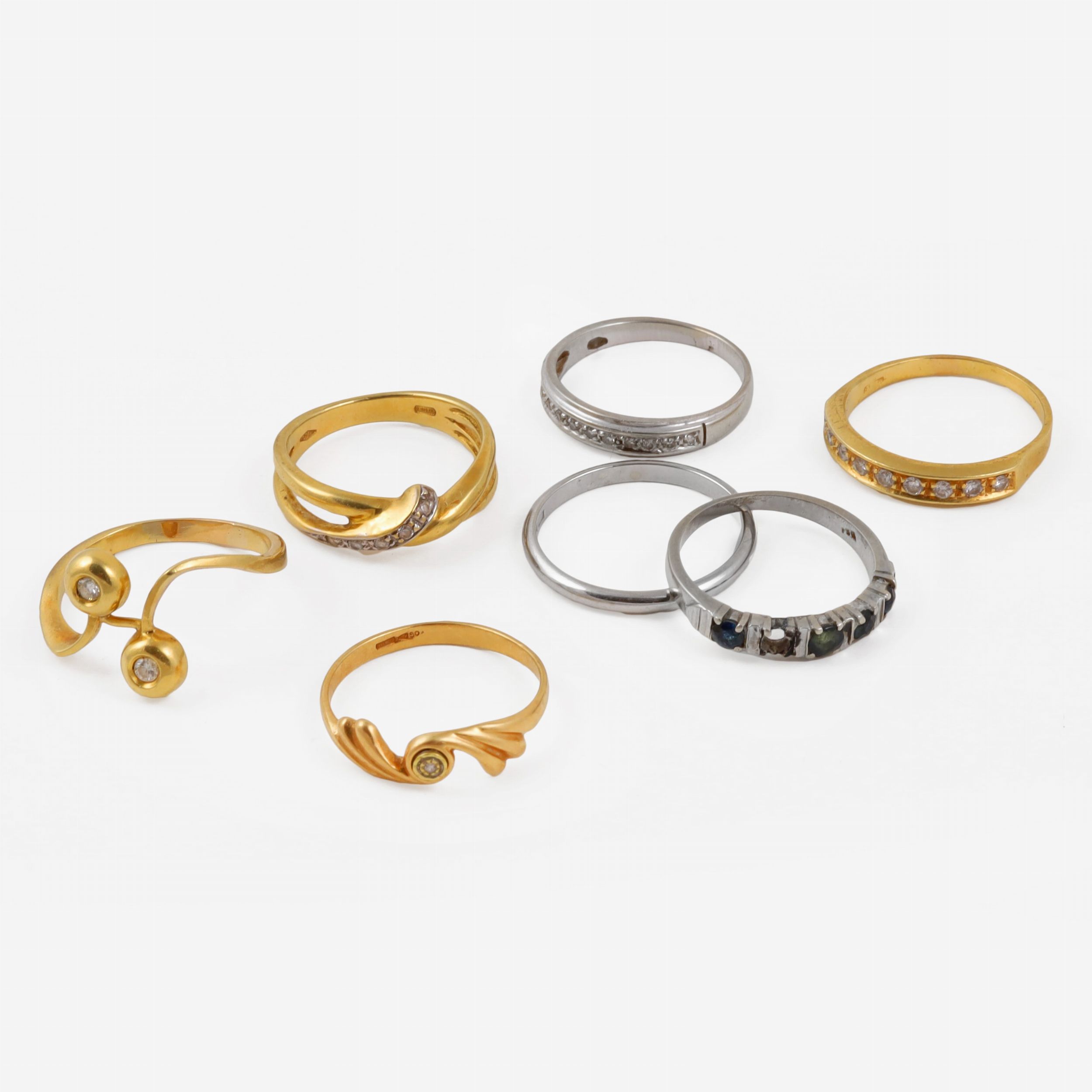 composto da sette anelli in oro con piccoli diamanti e pietre sintetiche (mancanze), gr. complessivi 19,1. Misura 13-14-15-16-18