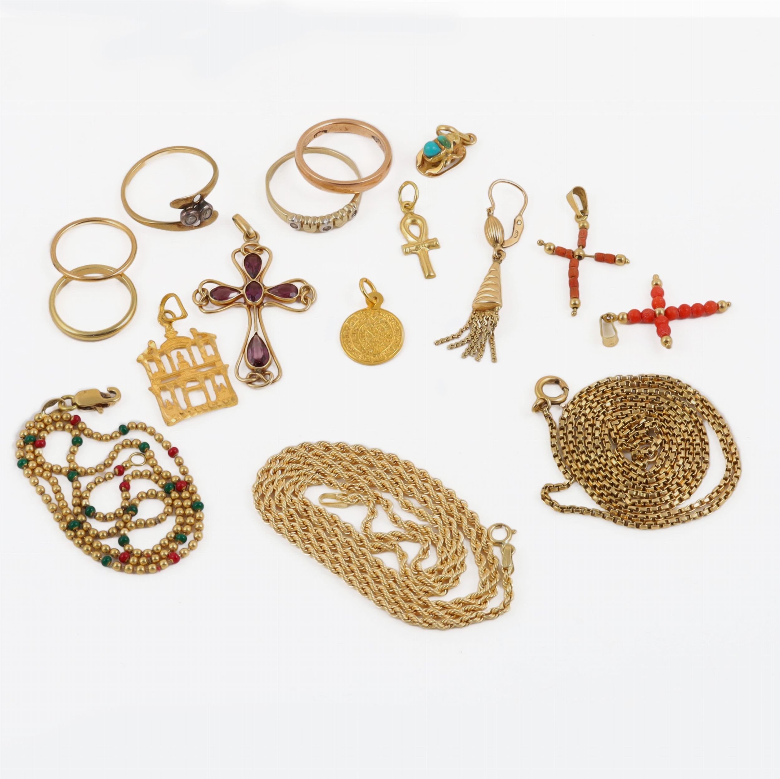in oro composto da tre collane, cinque anelli, sette pendenti e un orecchino, gr. complessivi 39,6. Lunghezza collane 64 cm, 60 cm e 41 cm