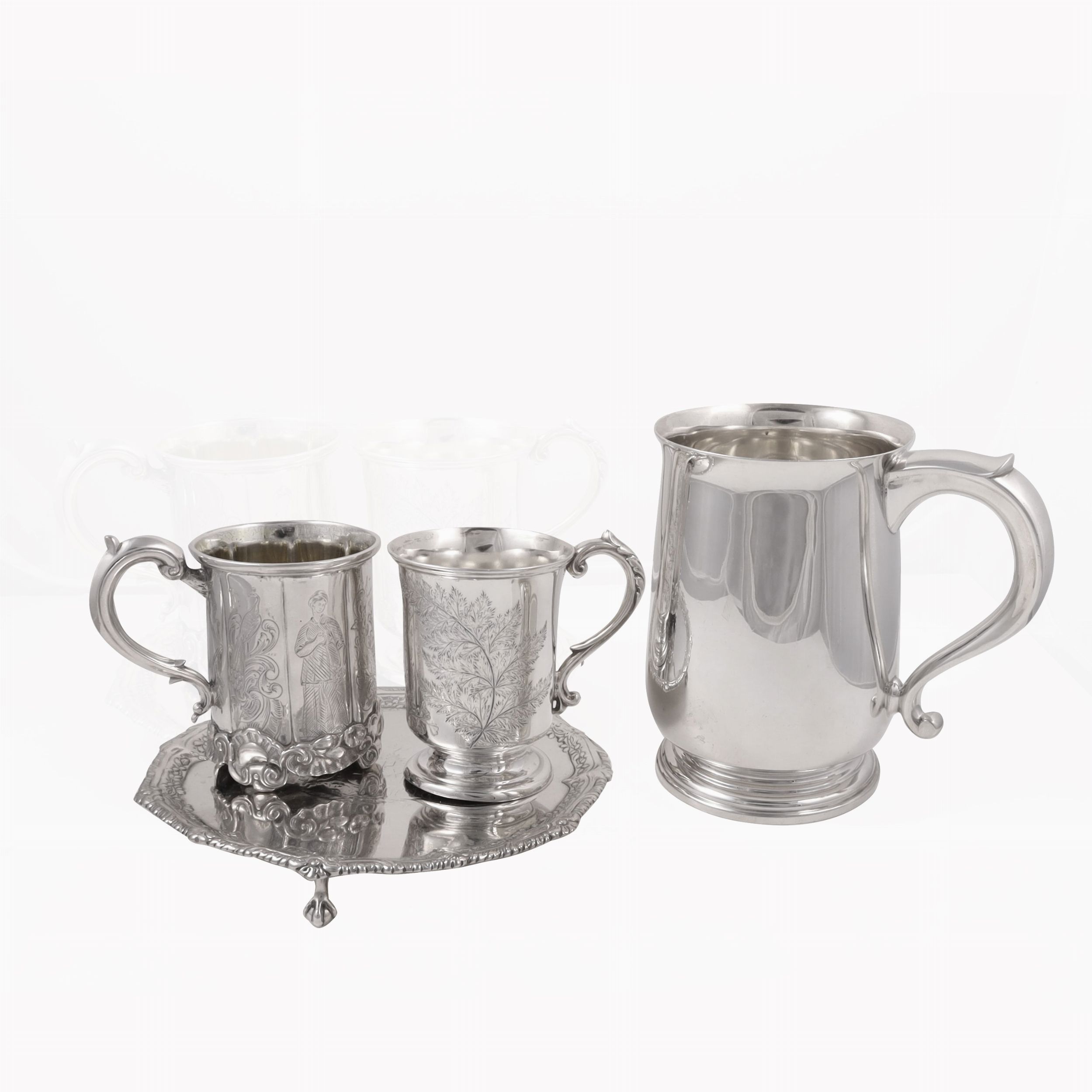 in argento composto da piccolo salver con bordura sbalzata a motivi fogliati e stemma centrale, boccale a corpo liscio con manico curvilineo e due piccoli boccali finemente cesellati entrambi con manico curvilineo a doppia mossa, gr. complessivi 900. Manifattura inglese