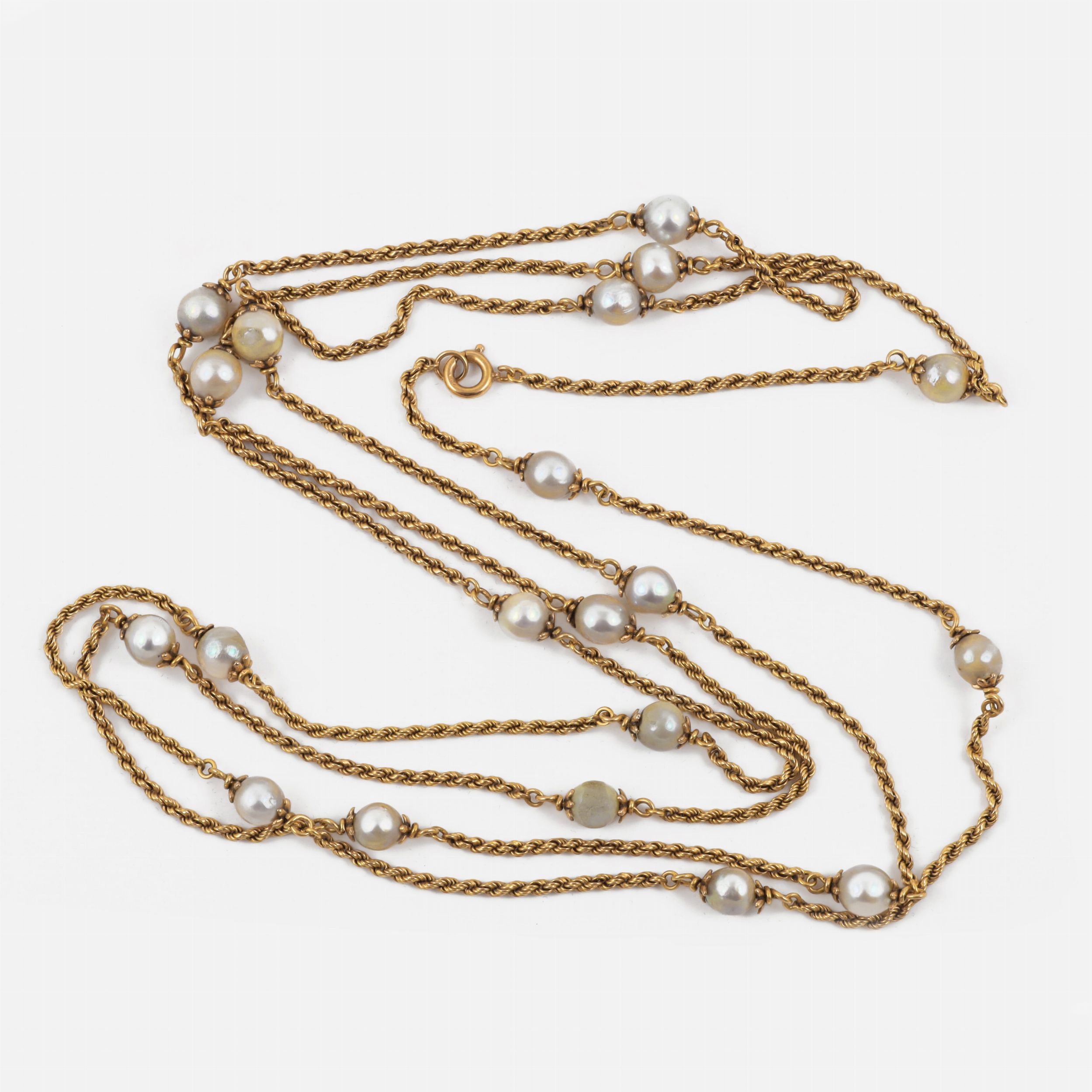 in oro giallo a cordoncino, inframezzata da perle coltivate, gr. 33. Lunghezza 130 cm