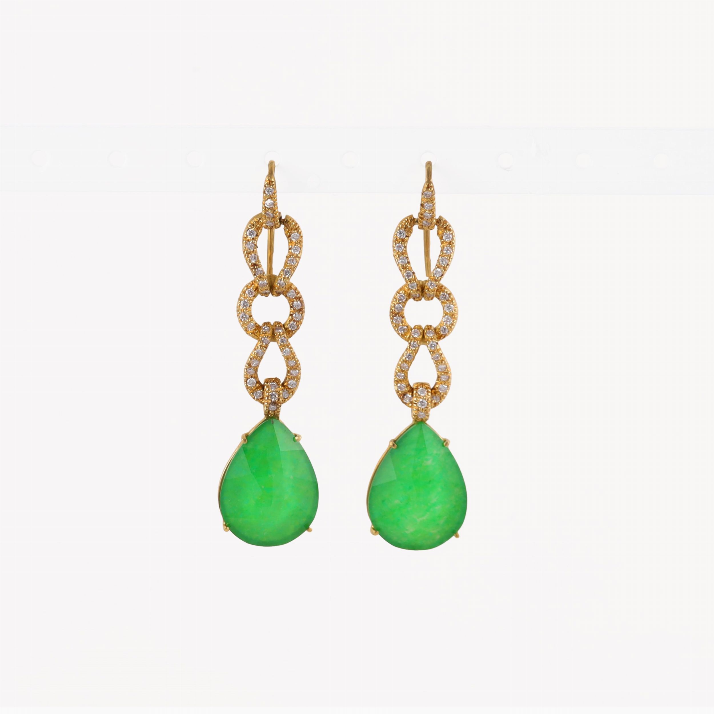 pendenti in oro rosa a maglie aperte con brillanti e 'triplette' verdi di quarzo e madreperla sospese, gr. 14,8. Lunghezza 6 cm