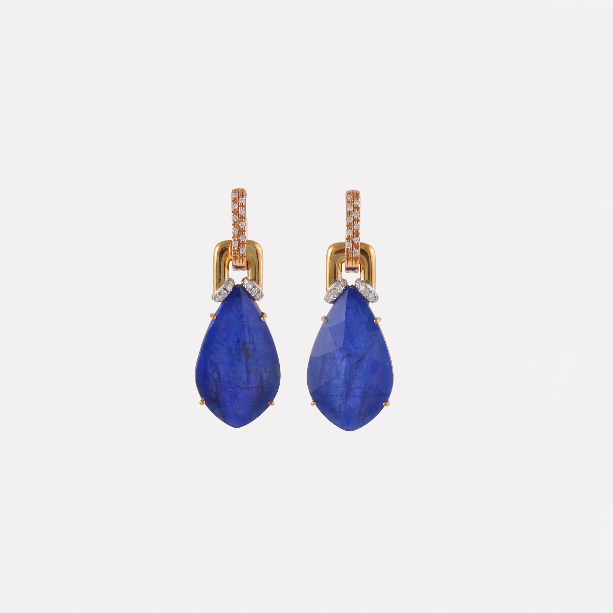 pendenti in oro giallo con brillanti del peso complessivo di 0,30 ct ca. e 'triplette' blu a goccia sfaccettate di quarzo e madreperla, gr. 19,5. Lunghezza 5 cm