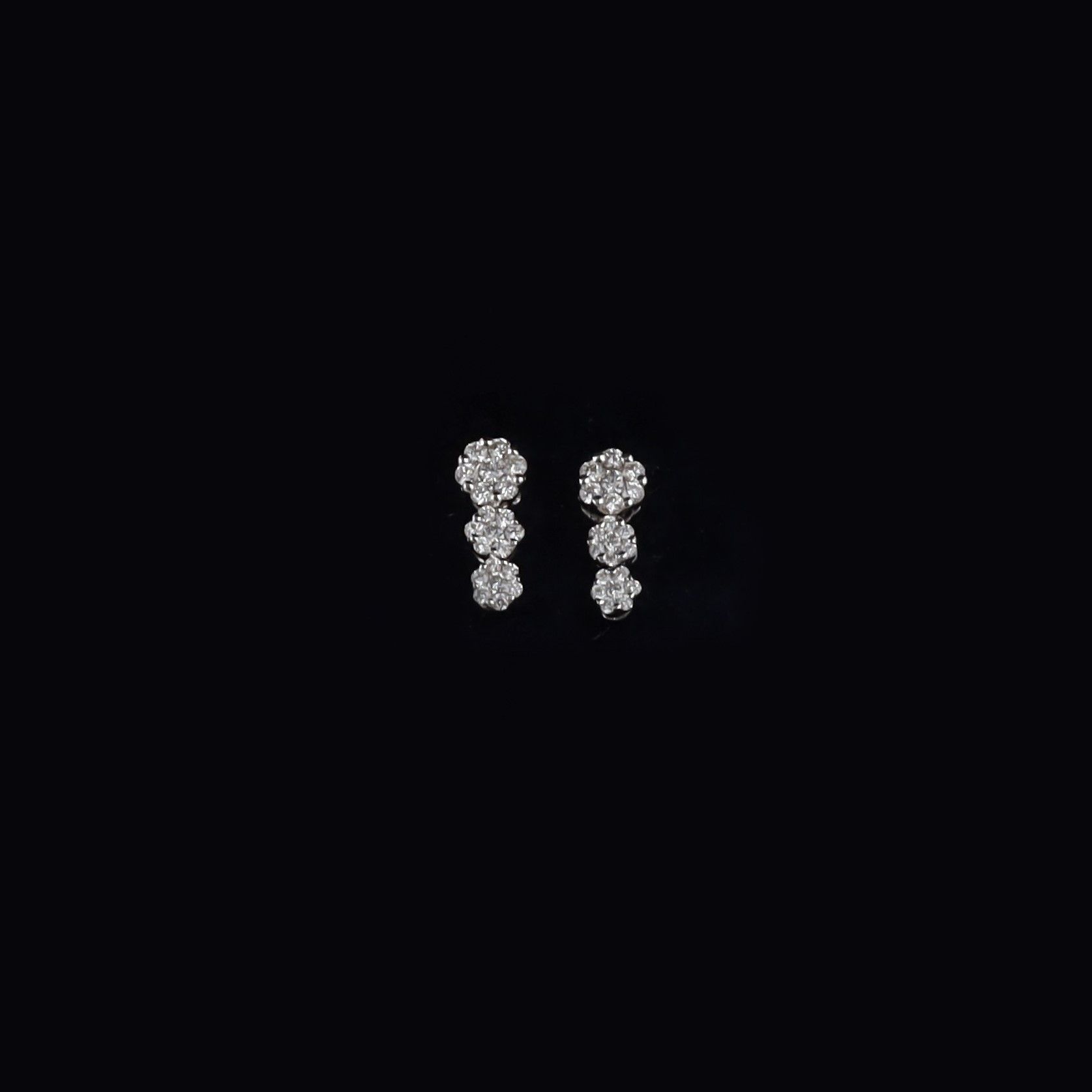 in oro bianco con motivi floreali formati da piccoli brillanti del peso complessivo di 0,90 ct ca., gr. 2,3. Corredati da custodia. Lunghezza 1,2 cm ca.