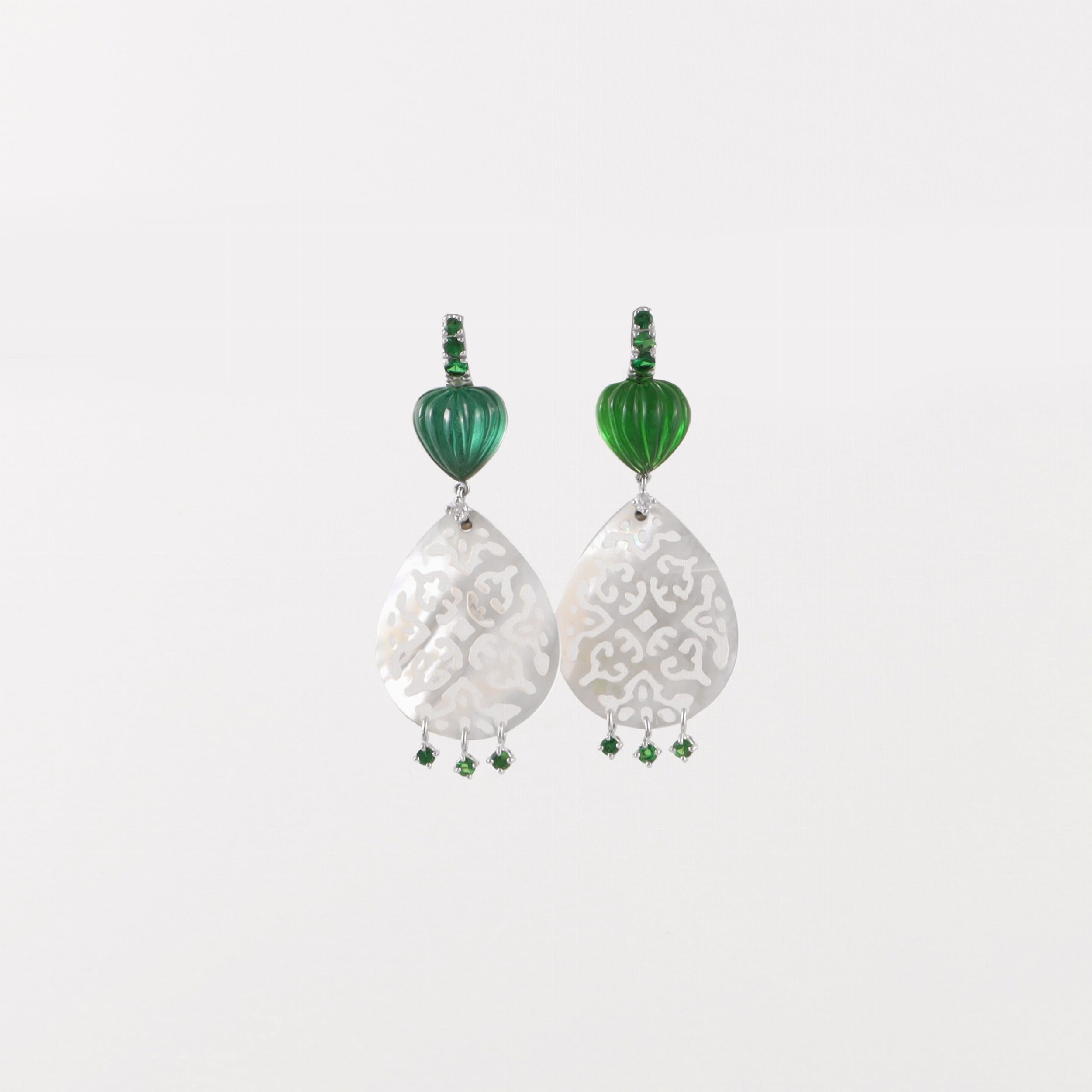 pendenti in oro bianco con tsavoriti, paste vitree verdi scanalate, brillanti e madreperle traforate, gr. 10,9. Lunghezza 6 cm ca.