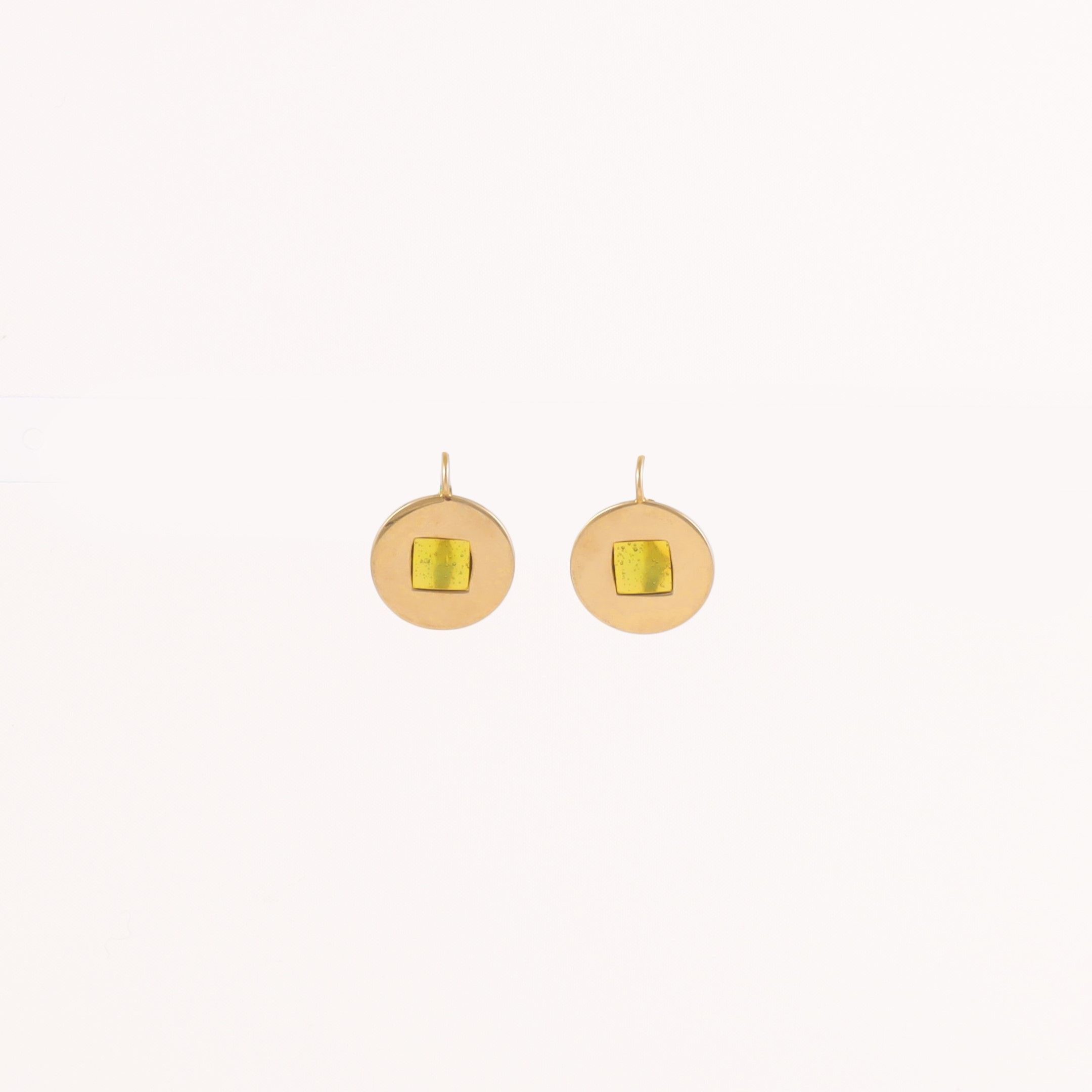 in oro giallo a disco con smalto verde 'plique-à-jour', gr. 6,6. Dimensioni 2 x 1,5 cm ca.