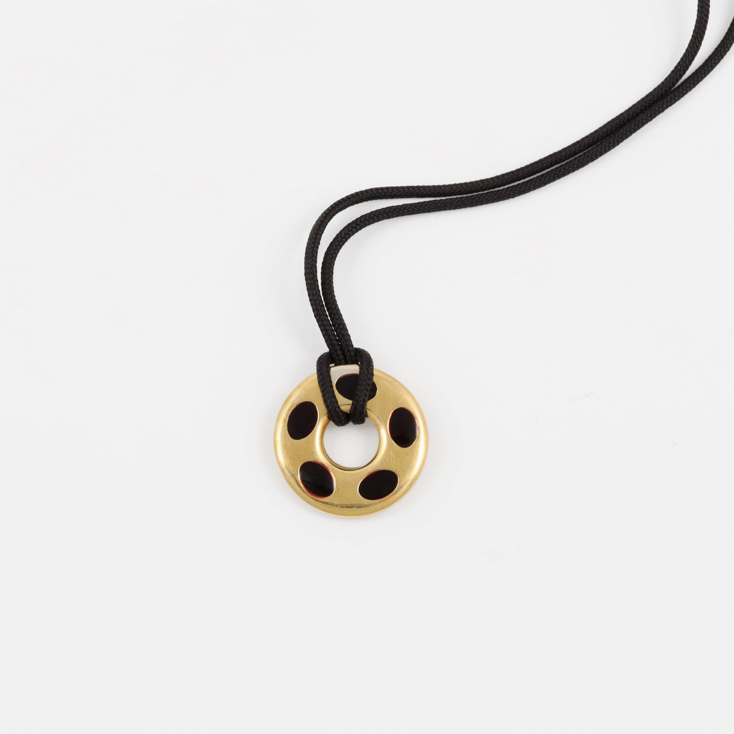 a forma circolare in oro giallo e smalto, gr. 6,9. Sostenuto da cordoncino. Diametro 2 cm