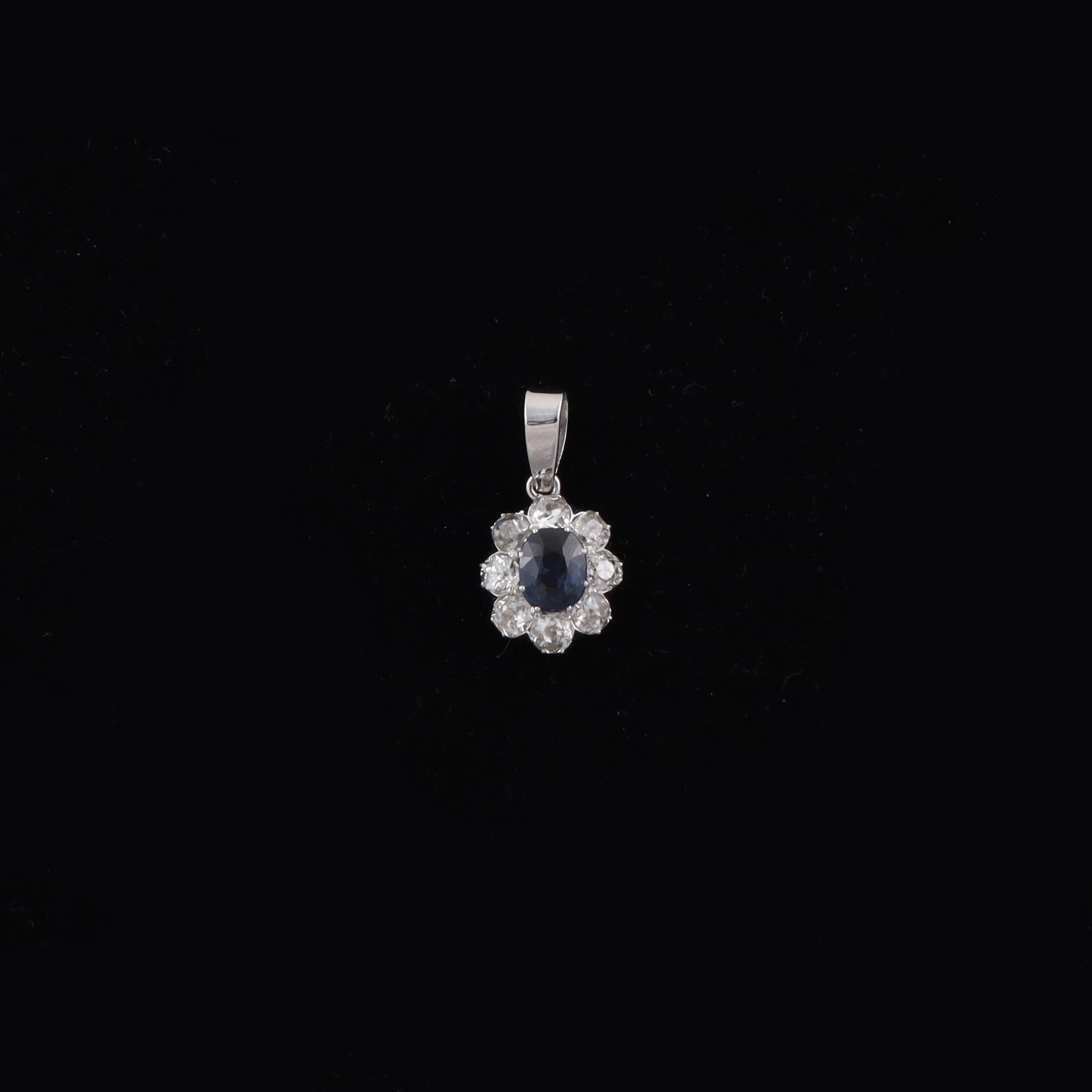 in oro bianco con zaffiro ovale del peso di 0,80 ct ca., contornato da diamanti taglio antico europeo del peso complessivo di 1 ct ca., gr. 2,8. Dimensioni 2,4 x 1,3 cm ca.