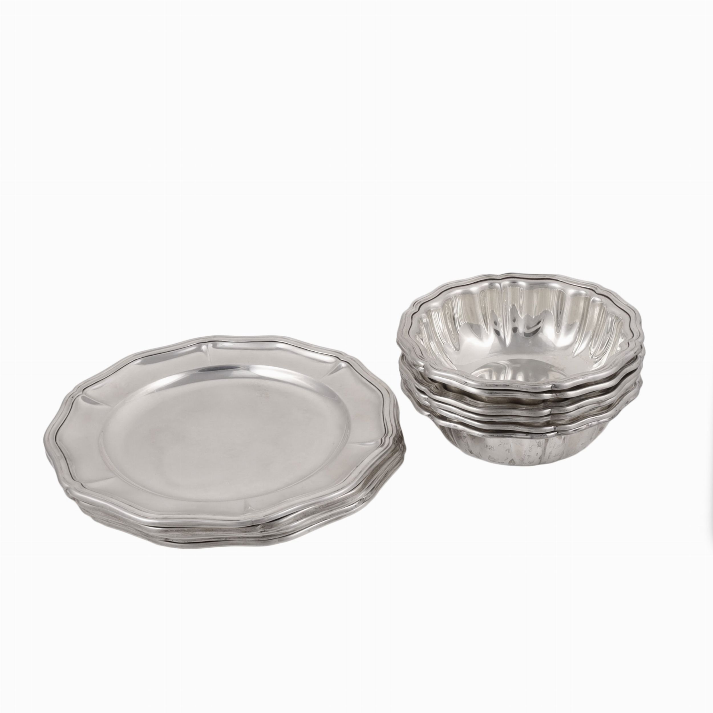 in argento con bordura gradinata di linea mossa, gr. complessivi 1.700 ca. Misura coppette 13 x 4 cm ca., diametro piattini 18 cm ca. Marchio della Fabbrica Argenteria Clementi - Bologna