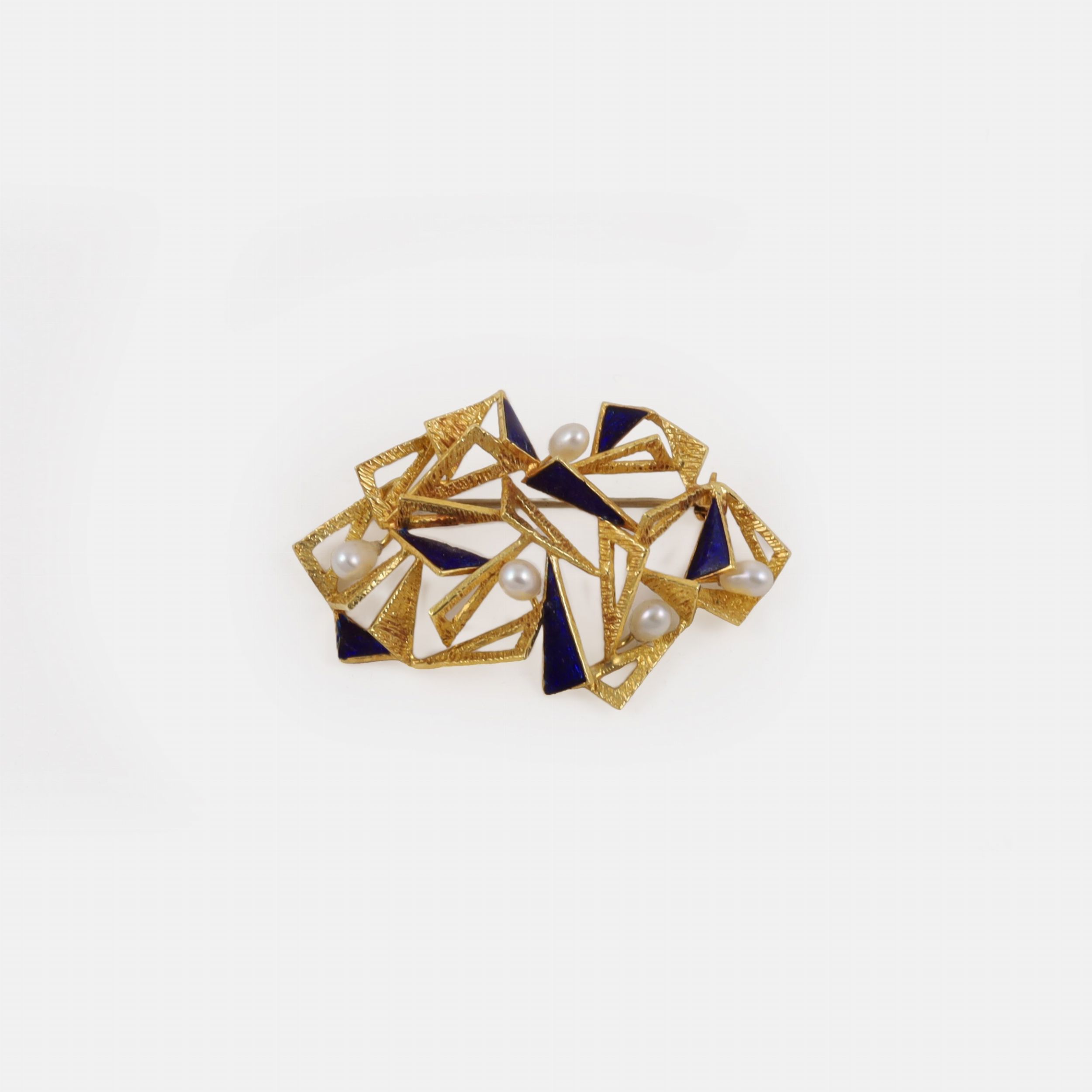 stilizzata a motivi triangolari in oro giallo, smalto blu e perle d'acqua dolce, gr. 8,5. Dimensioni 4,5 x 3 cm ca.