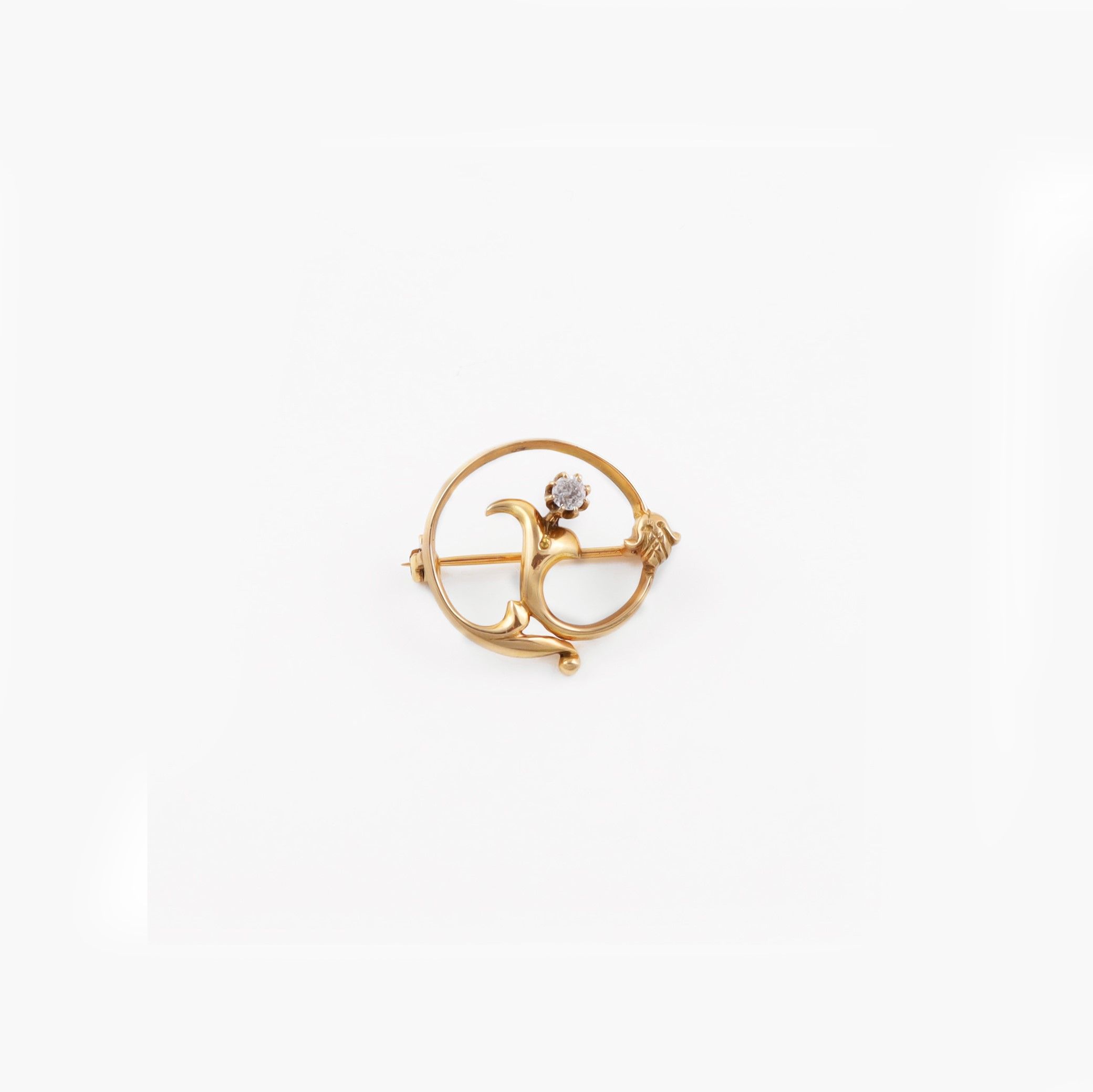 in oro giallo a motivo vegetale con piccolo diamante taglio antico europeo. gr. 5,6. Diametro 2,5 cm ca.