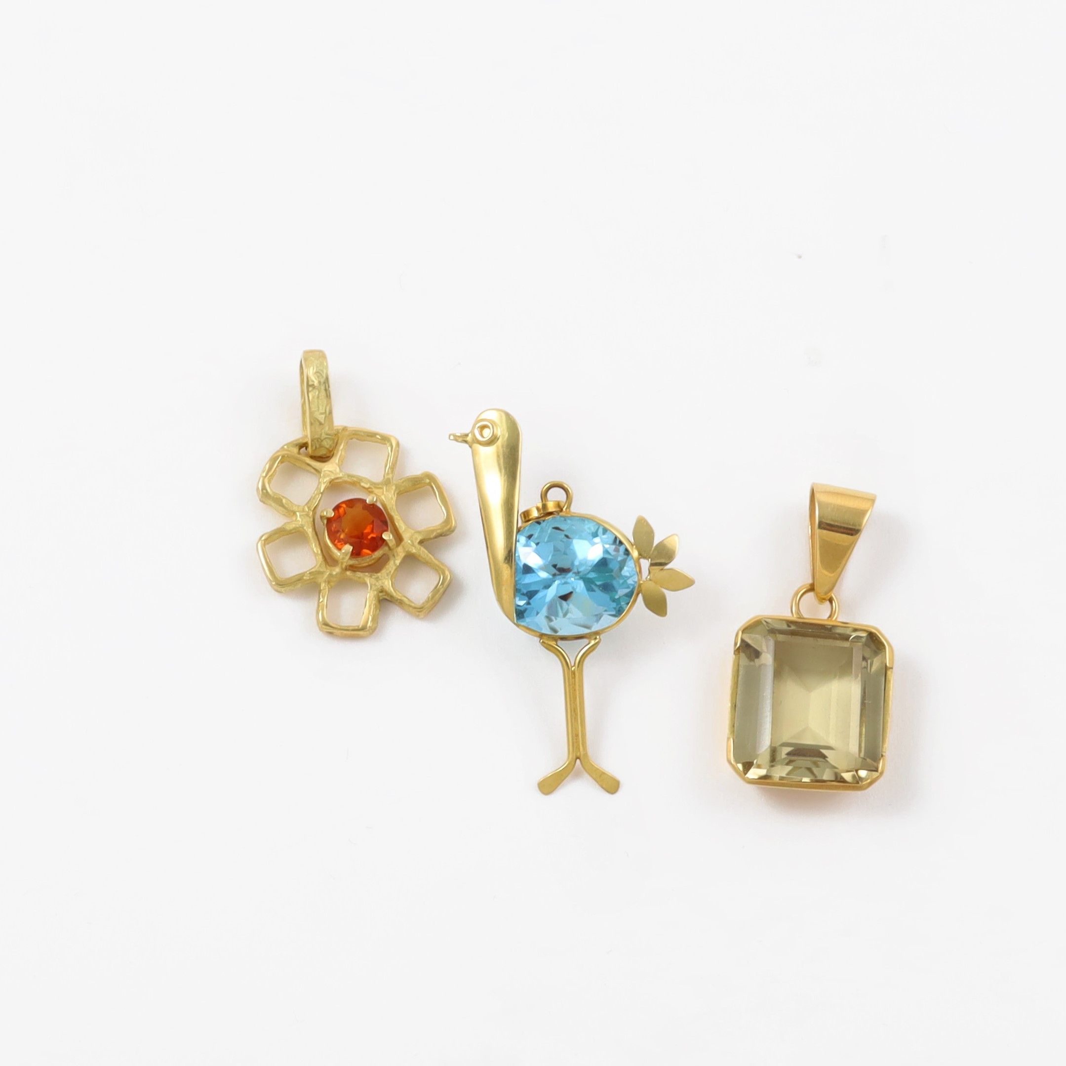 a differenti fogge in oro giallo con quarzi e topazio azzurro, gr. complessivo 15,3. Dimensioni 3 x 2 cm; 4 x 2,5 cm e 3 x 1,5 cm ca. Un pendente punzonato 1588 MI (Quaglia Luigi & C. - Milano)