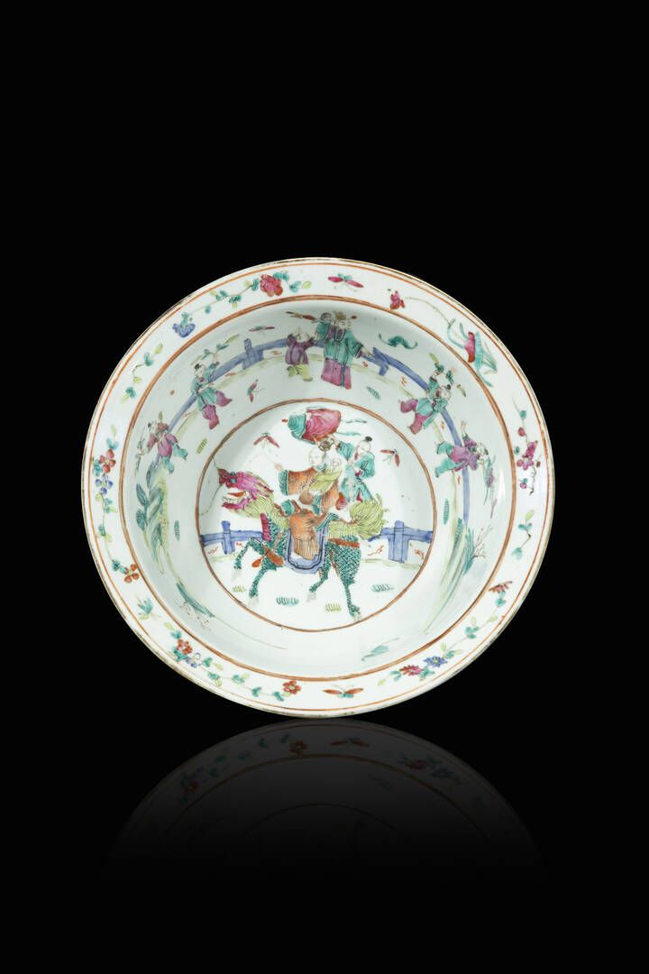 Bacile in porcellana Famiglia Rosa decorato con personaggi Cina dinastia Qing XIX sec. H cm 10 Diam cm 30