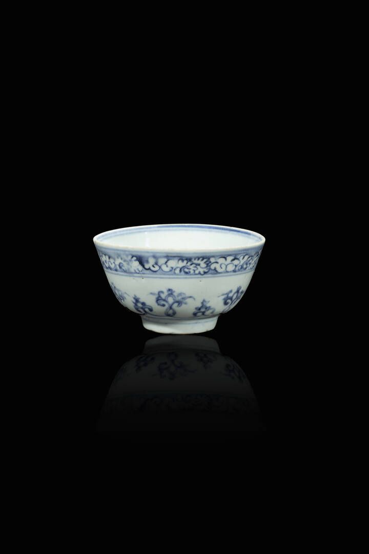 Ciotola in porcellana bianca e blu dipinta a motivi floreali Cina dinastia Qing XVIII sec. H cm 13 Diam cm 7