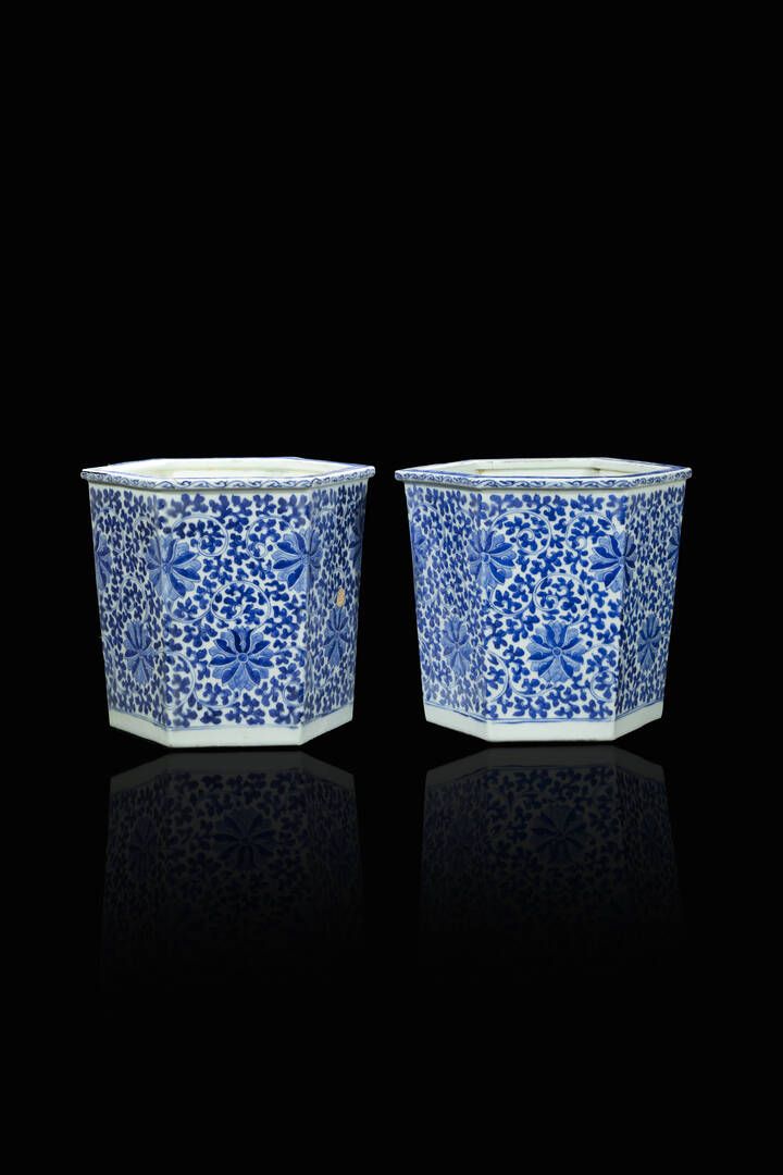 Coppia di giardiniere in porcellana bianca e blu con decori floreali Cina dinastia Qing XIX sec. H cm 26x28