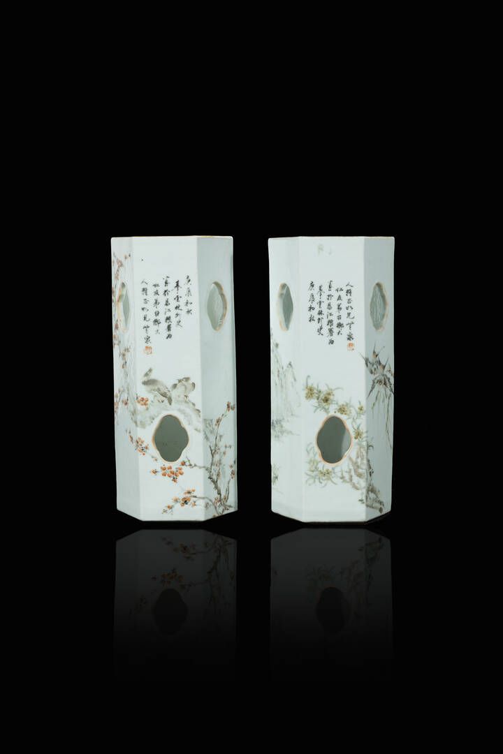Coppia di porta cappelli in porcellana Famiglia Rosa dipinti con decori paesaggistici e iscrizioni Cina Repubblica XX sec. H cm 29 Diam cm 13