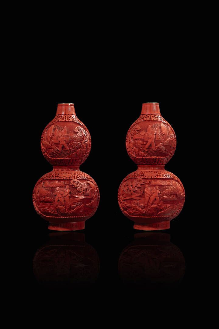 Coppia di vasi in lacca a forma di zucca decorati con personaggi nei campi Cina Repubblica XX sec. H cm 30