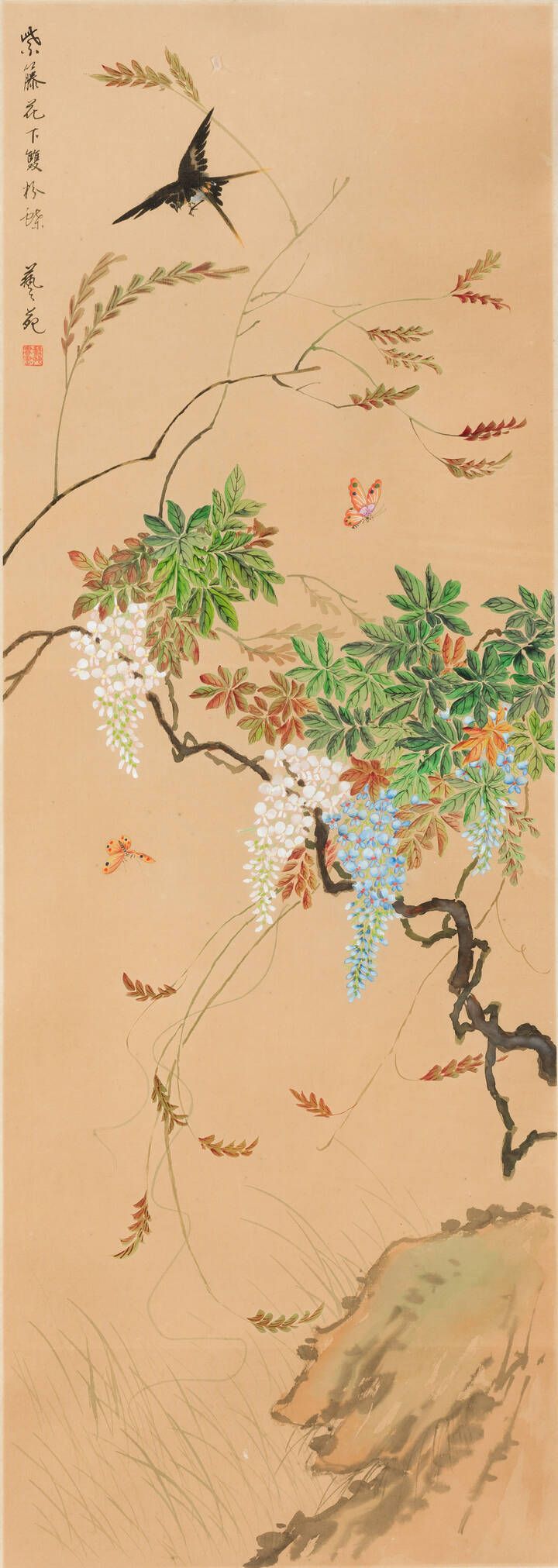 Dipinto su seta con uccello e farfalle Cina Repubblica XX Sec. H cm 157x54