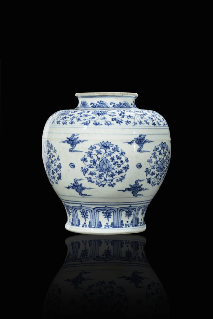 Giara in porcellana bianca e blu dipinta a decori floreali Cina dinastia Qing XIX sec. H cm 27 Diam cm 26