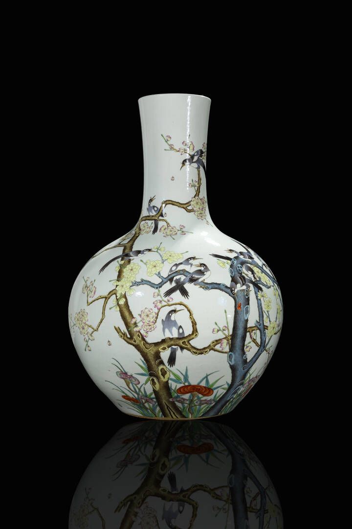 Grande vaso a pallone in porcellana dipinta con uccelli fra i rami Cina Repubblica XX sec. H cm 57 Diam cm 37