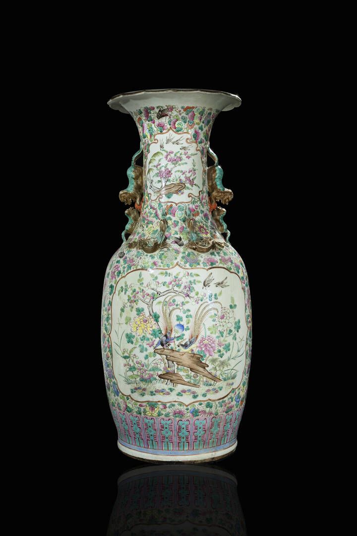 Grande vaso in porcellana Famiglia Rosa decorato con uccelli e fiori entro riserve e draghi in rilievo Cina dinastia Qing XIX sec. H cm 90 Diam cm 36