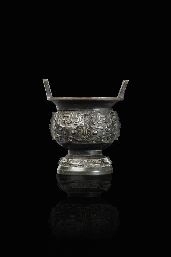 Incensiere in bronzo brunito decorato a motivi arcaici Cina dinastia Qing XVIII sec H cm 13x12