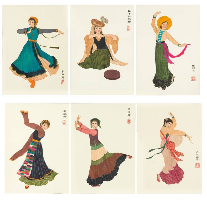 Lotto composto da 6 dipinti su cartoncino raffiguranti personaggi femminili in costume Cina XX Sec. 28x20cm