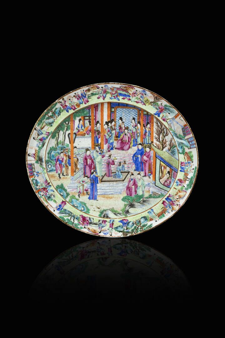 Piatto in porcellana Canton decorato con scene di corte Cina dinastia Qing XIX sec Diam cm 48x43